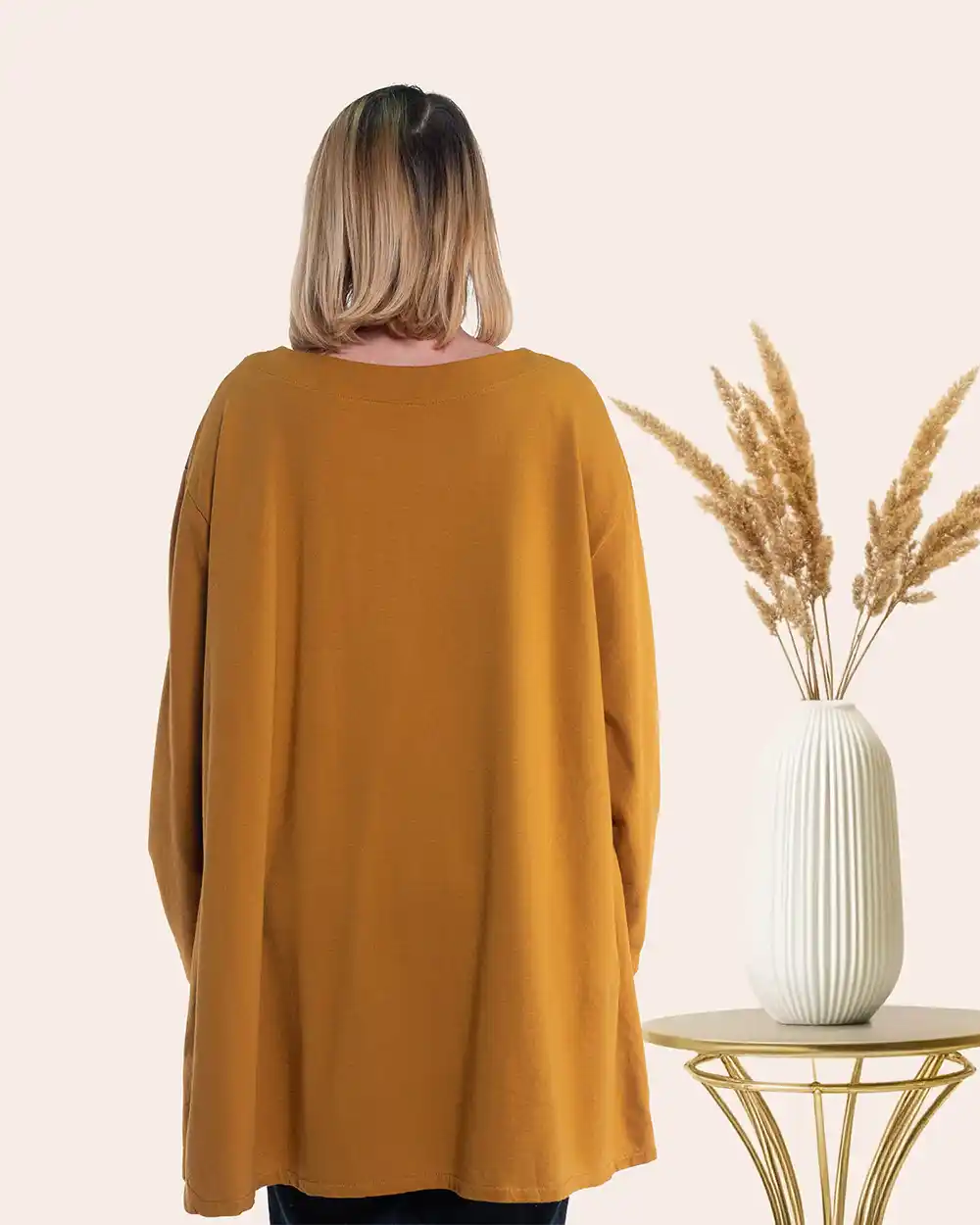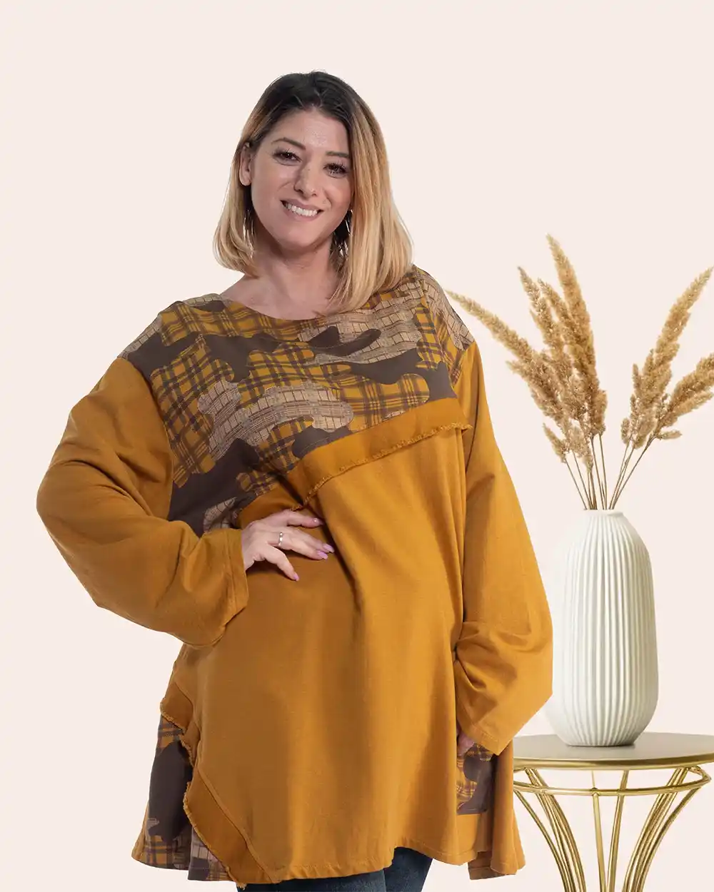 Bluză lungă urban-retro muștar ce redefinește confortul urban prin croiala sa oversize, de tip tunică. Linia sa fluidă cade lejer peste șolduri, asigurând libertate totală de mișcare și o alură relaxată, plină de stil. Confecționată dintr-un bumbac de calitate, cu o textură fină asemănătoare unui tricou premium, această piesă devine instantaneu un favorit pentru zilele dinamice. Partea superioară este animată de un imprimeu abstract discret, iar nuanța solară de muștar aduce o pată de culoare vibrantă garderobei tale. O bandă aplicată cu franjuri delicate adaugă o notă distinctivă, de inspirație retro, în timp ce buzunarul funcțional din partea de jos completează aspectul modern și practic.