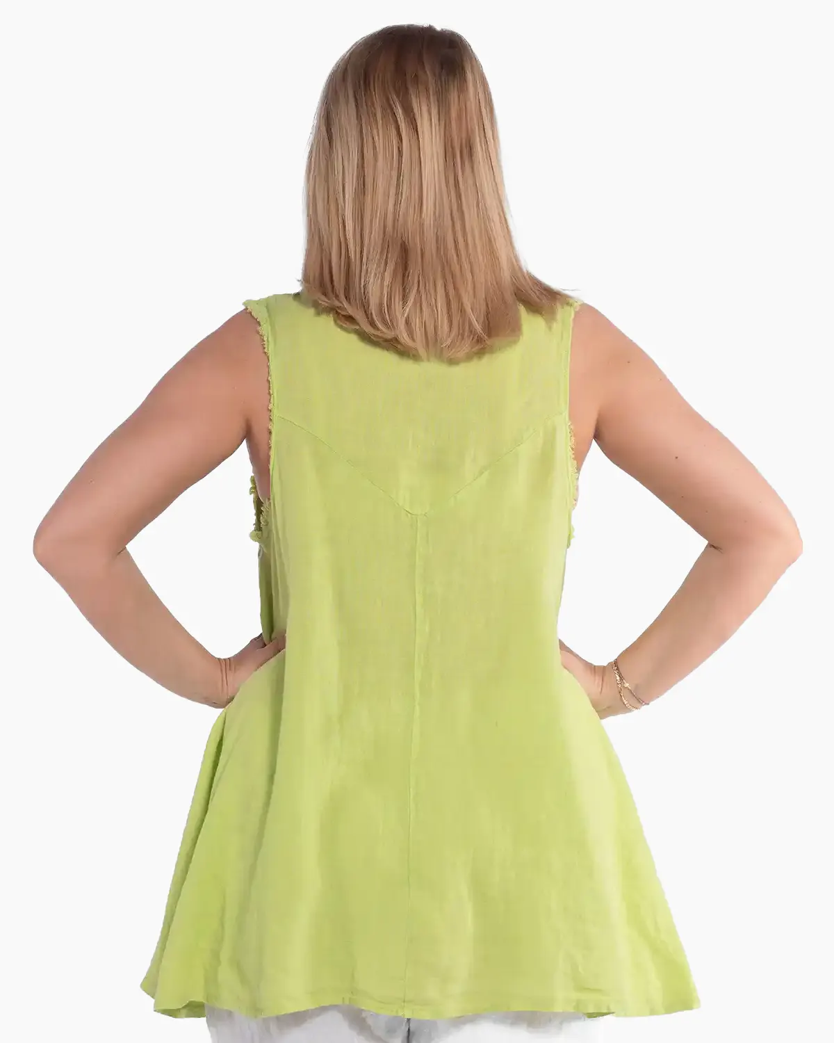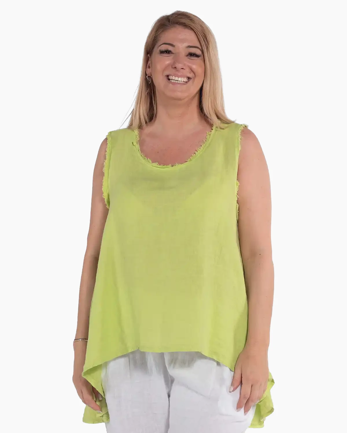 Bluză urbană lime din in, o piesă vaporoasă și răcoroasă, perfectă pentru zilele de vară. Croiala sa relaxată, cu un design minimalist și franjuri delicate, adaugă o notă de stil ținutelor tale urbane sau de plajă, asigurând un confort deosebit.
