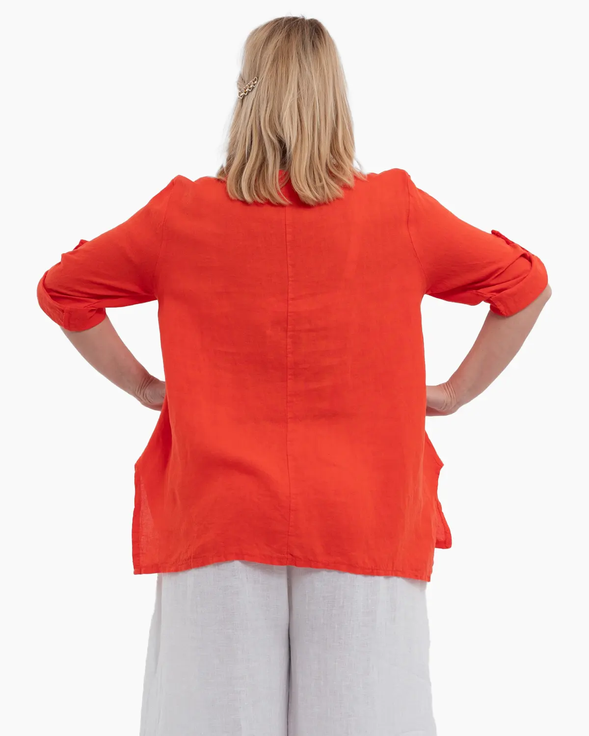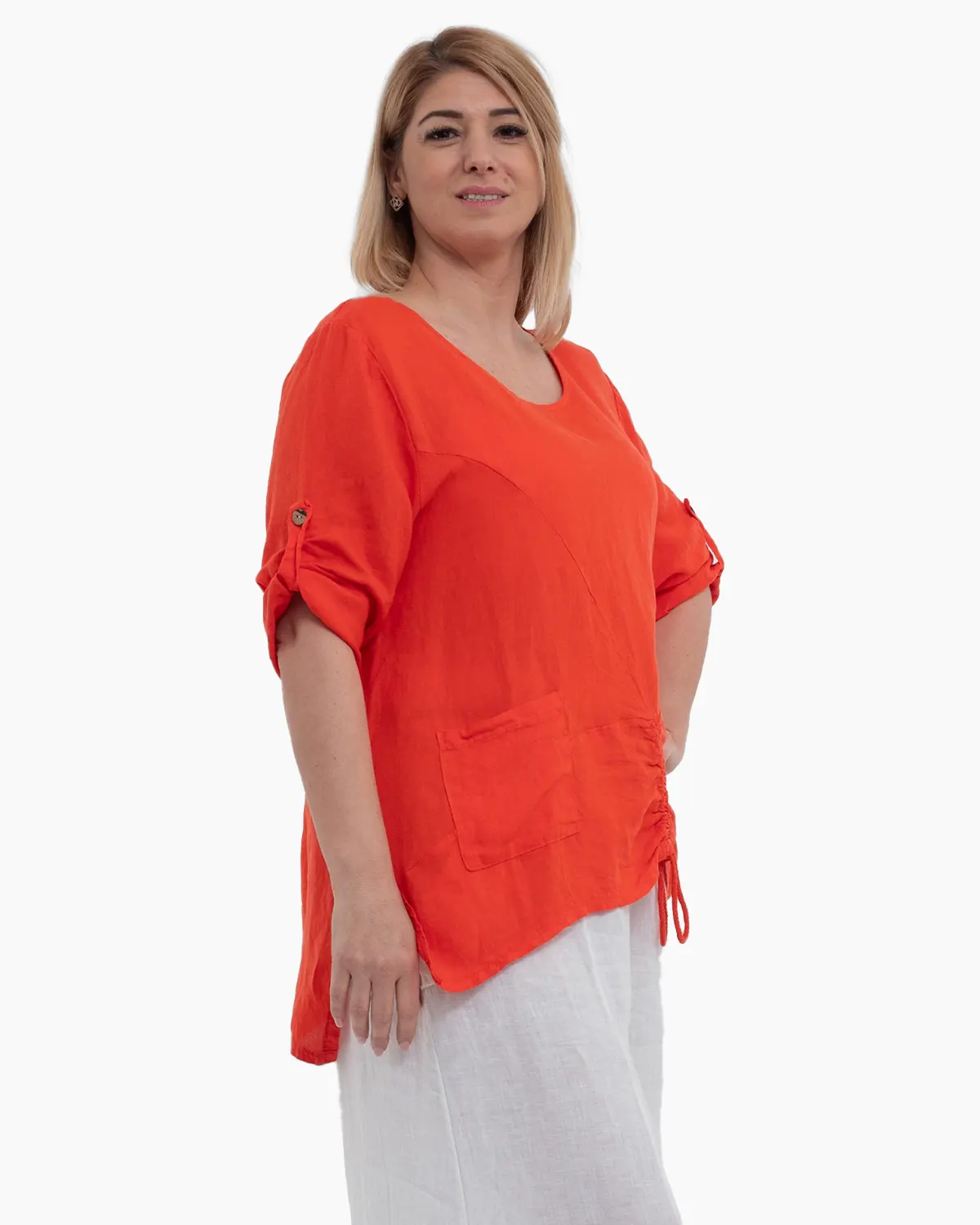 Bluza portocalie din in cu maneci trei sferturi si buzunare