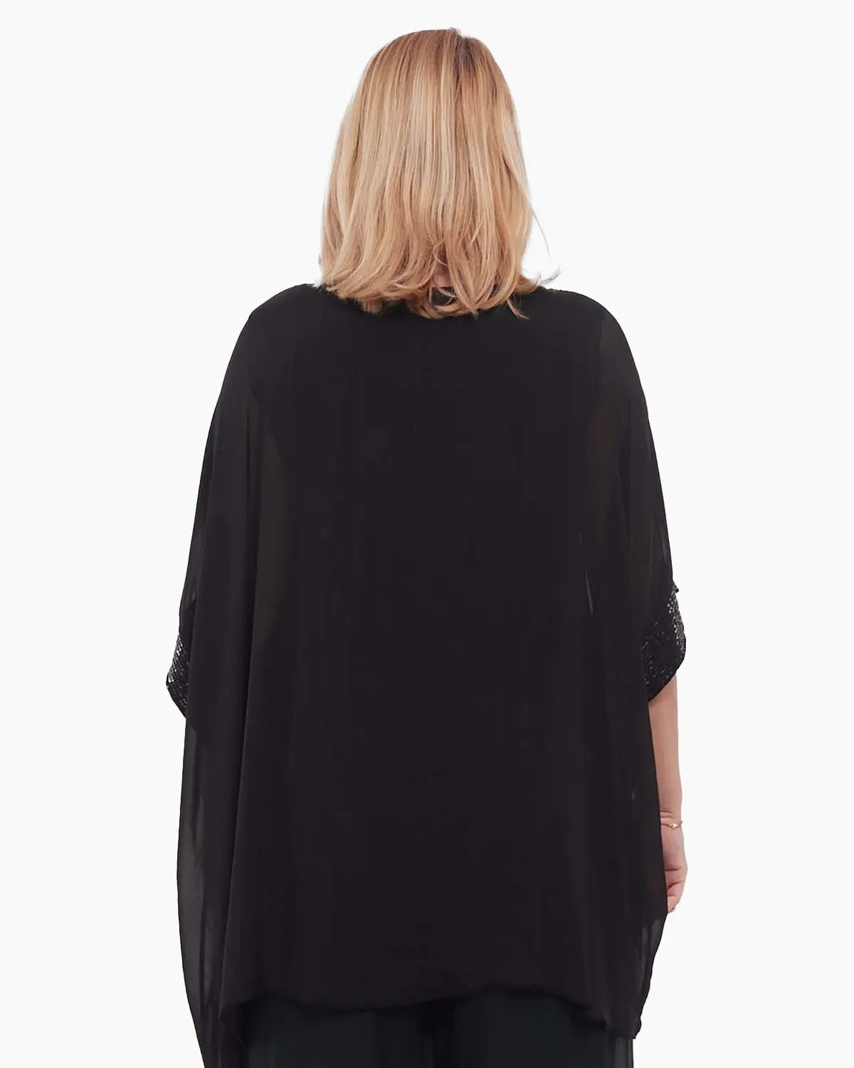 Bluză neagră romantică, o piesă statement elegantă, cu paiete delicate la mâneci și în talie. Mânecile ample 3/4 și croiala lejeră din vâscoză fină îți conferă un look sofisticat și confortabil, ideal pentru evenimente speciale.