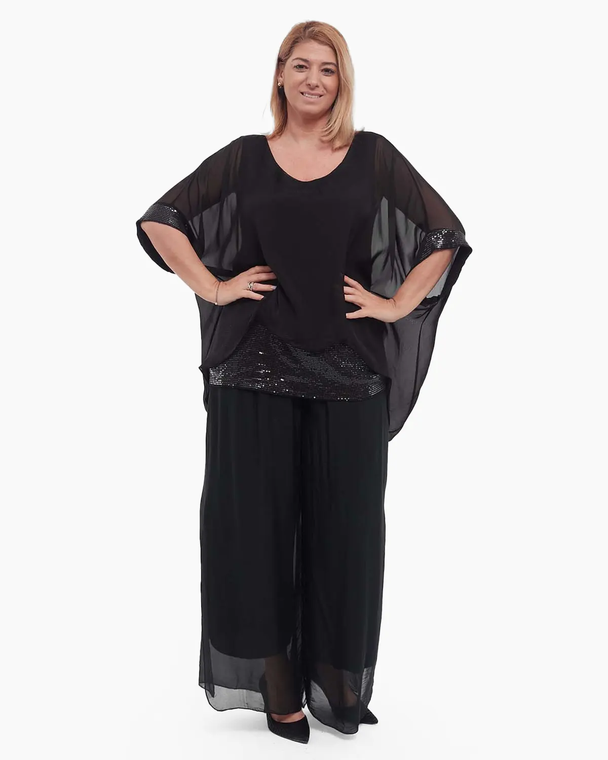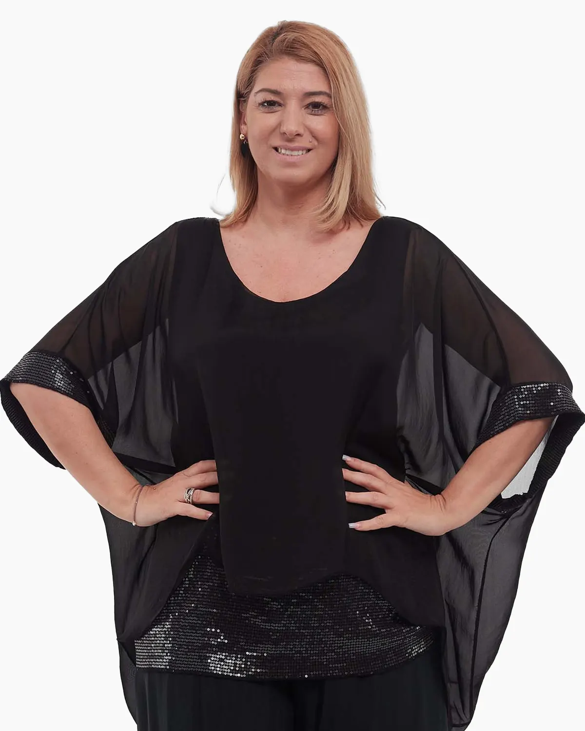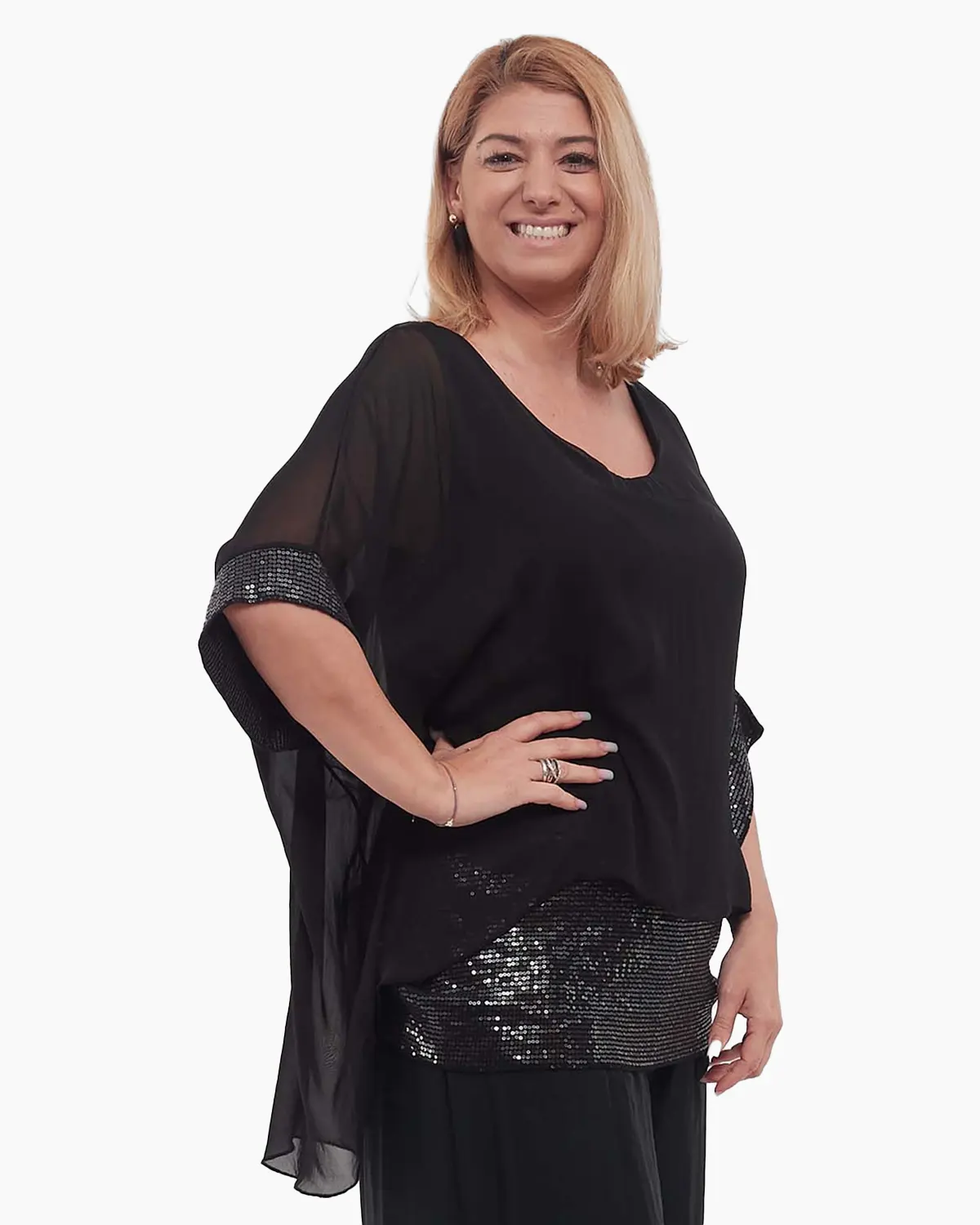 Realizată dintr-o vâscoză delicată, fluidă și extrem de plăcută pe piele, această bluză îți promite un confort desăvârșit pe parcursul întregii zile sau seri. Strălucirea subtilă a paietelor, aplicate cu măiestrie pe mânecile ample trei sferturi și pe brâul integrat ce subliniază frumos talia, transformă orice ținută într-una memorabilă.
