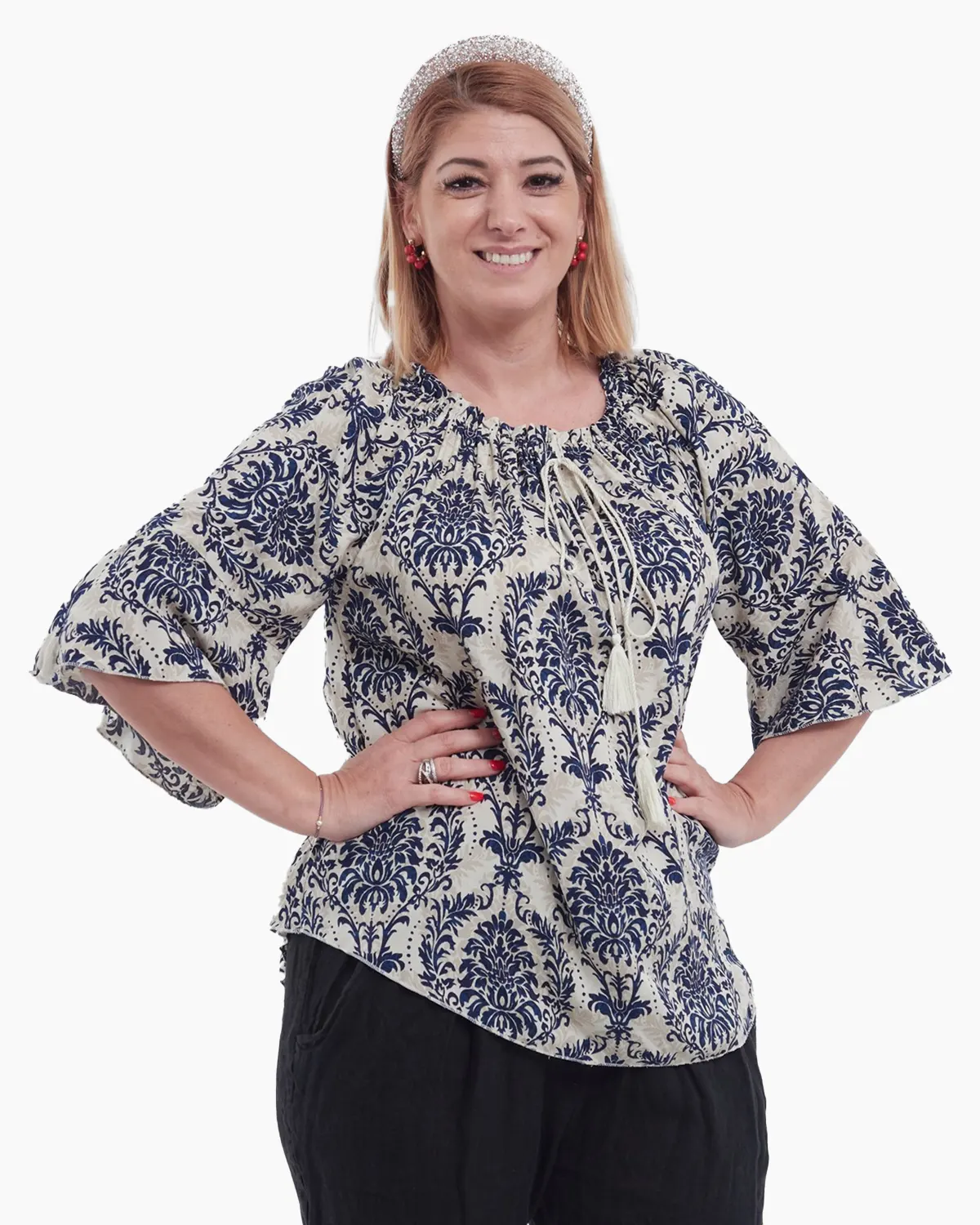 Bluza bleumarin tip ie, vaporoasa, cu imprimeu floral si detalii fermecatoare: volane la maneci, ciucuri si snur la guler. Perfecta pentru un look casual-chic de vara, adauga o nota de eleganta feminina fiecarei aparitii.