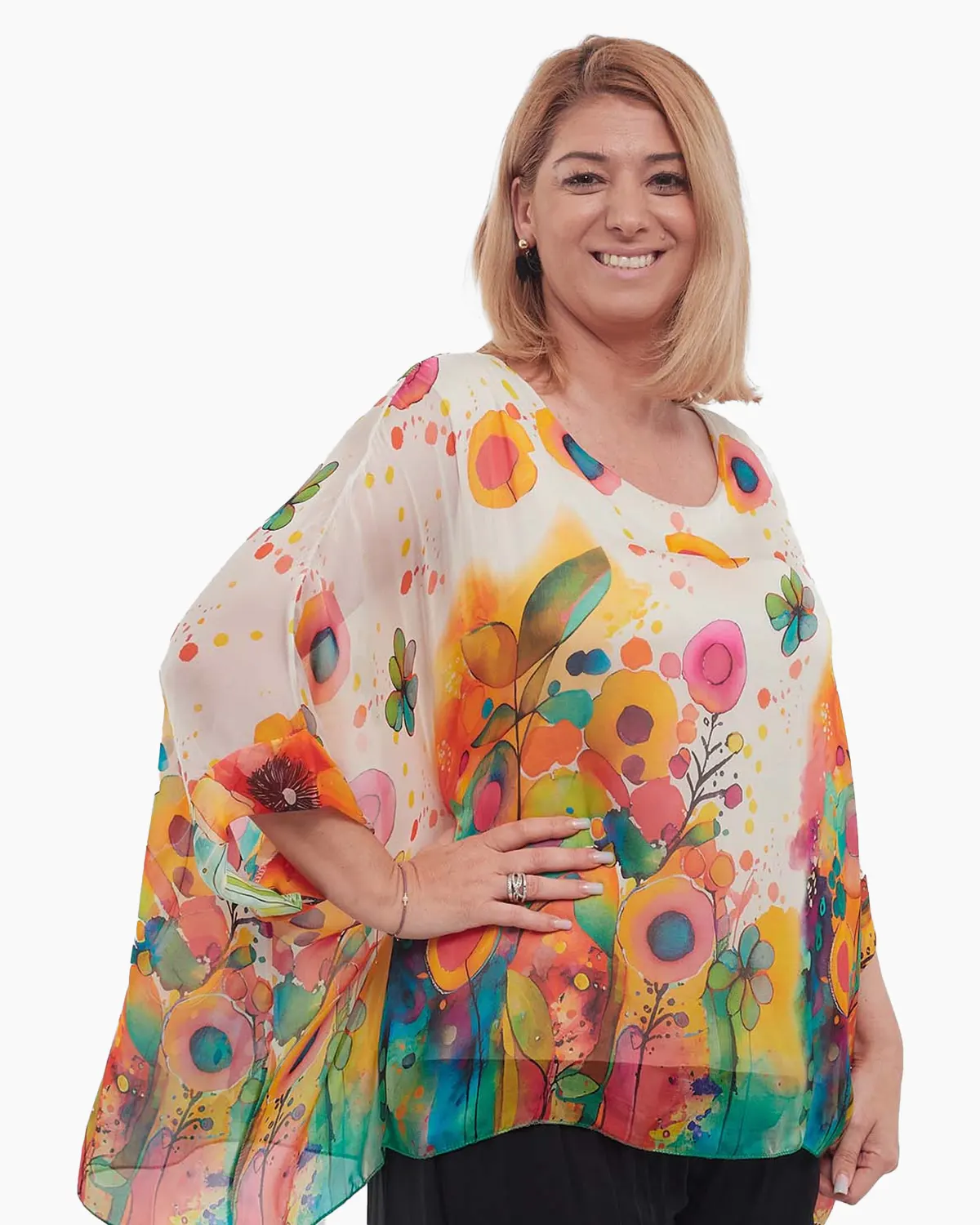 Confecționată dintr-o mătase delicată, bluza îți învăluie silueta cu o atingere fină și un aspect elegant, fiind ideală pentru a aduce un plus de stil garderobei tale. Croiala sa dreaptă și amplă, alături de mânecile trei sferturi tip dolman, cu umerii căzuți, asigură o libertate de mișcare deplină și un confort desăvârșit pe parcursul întregii zile.