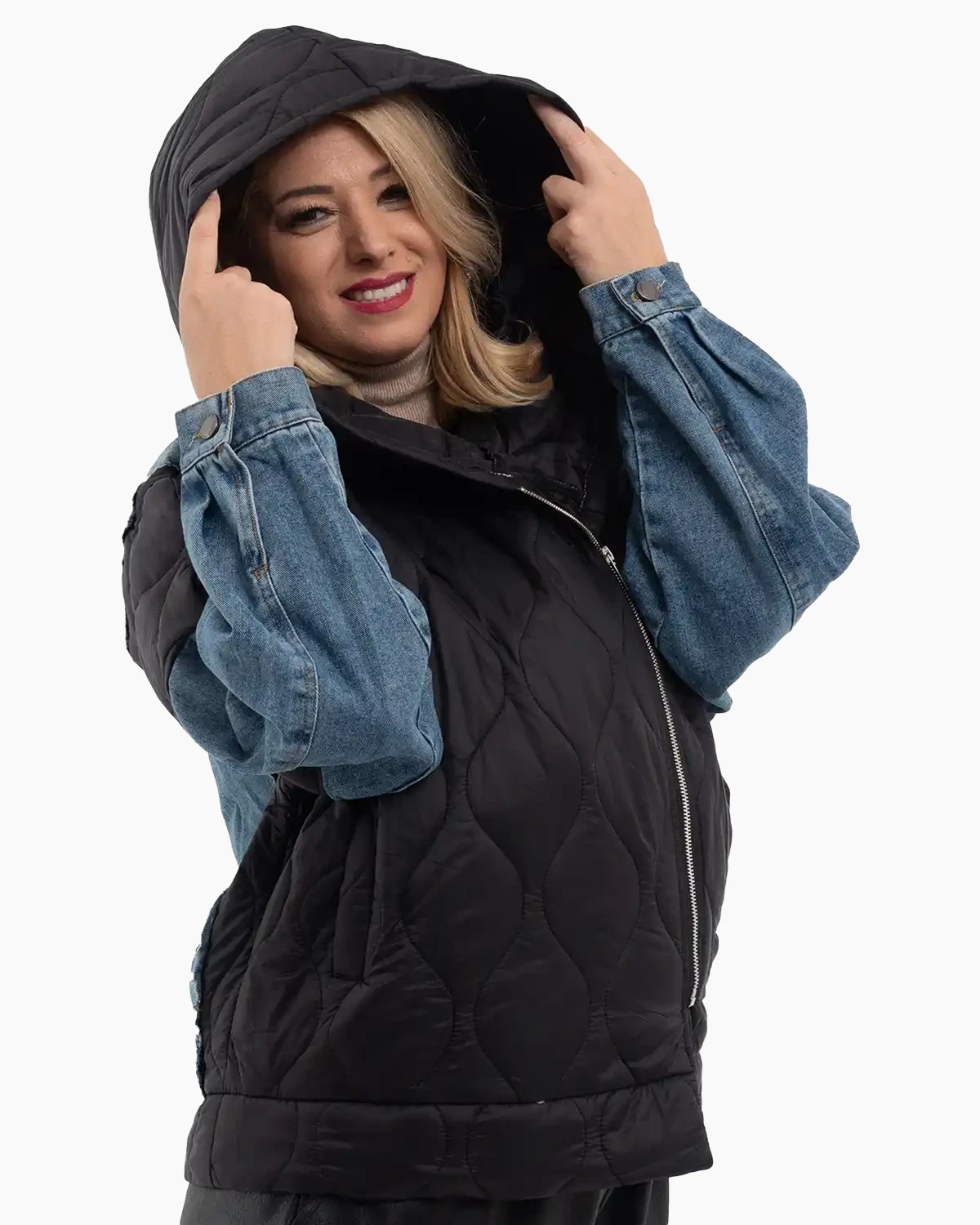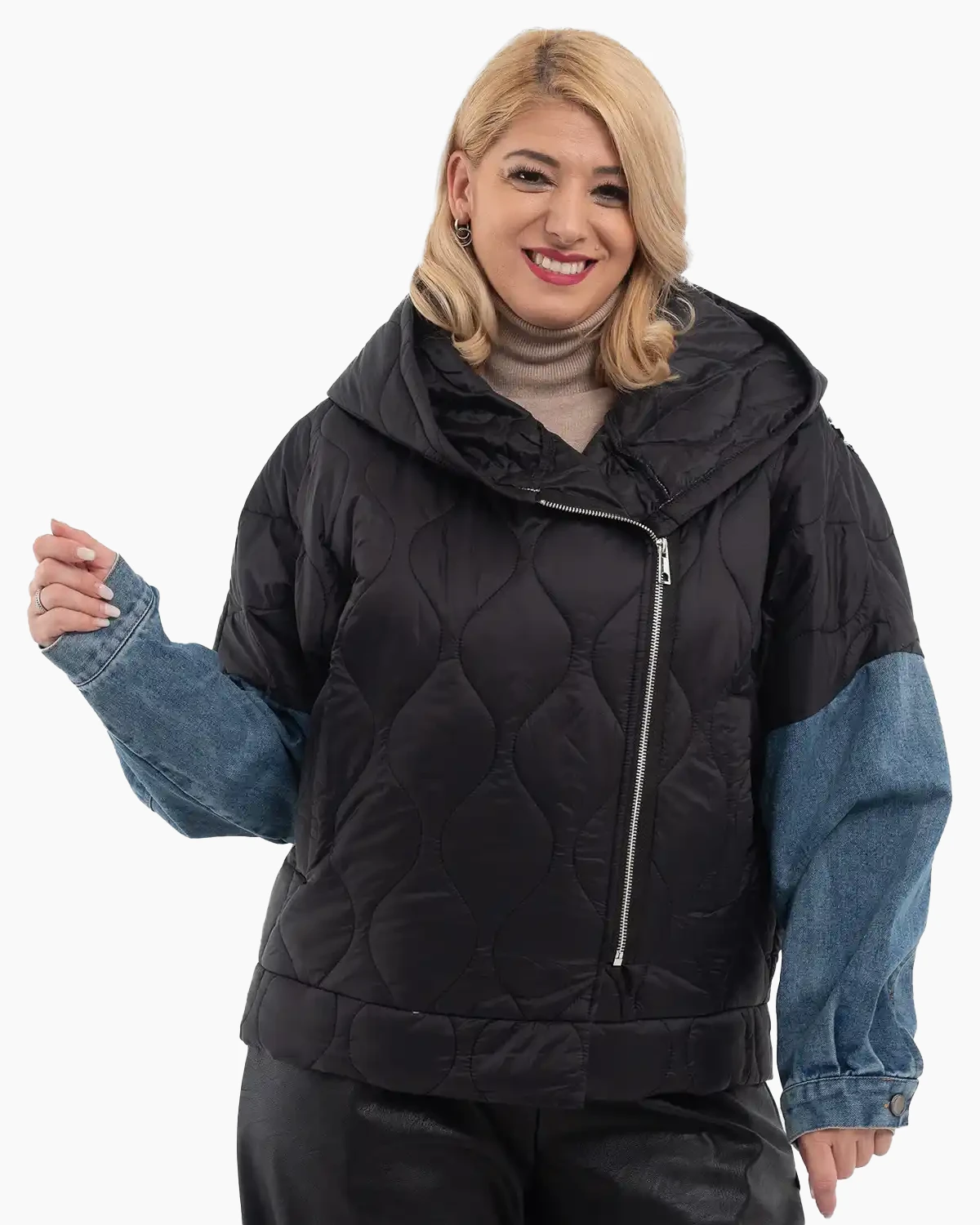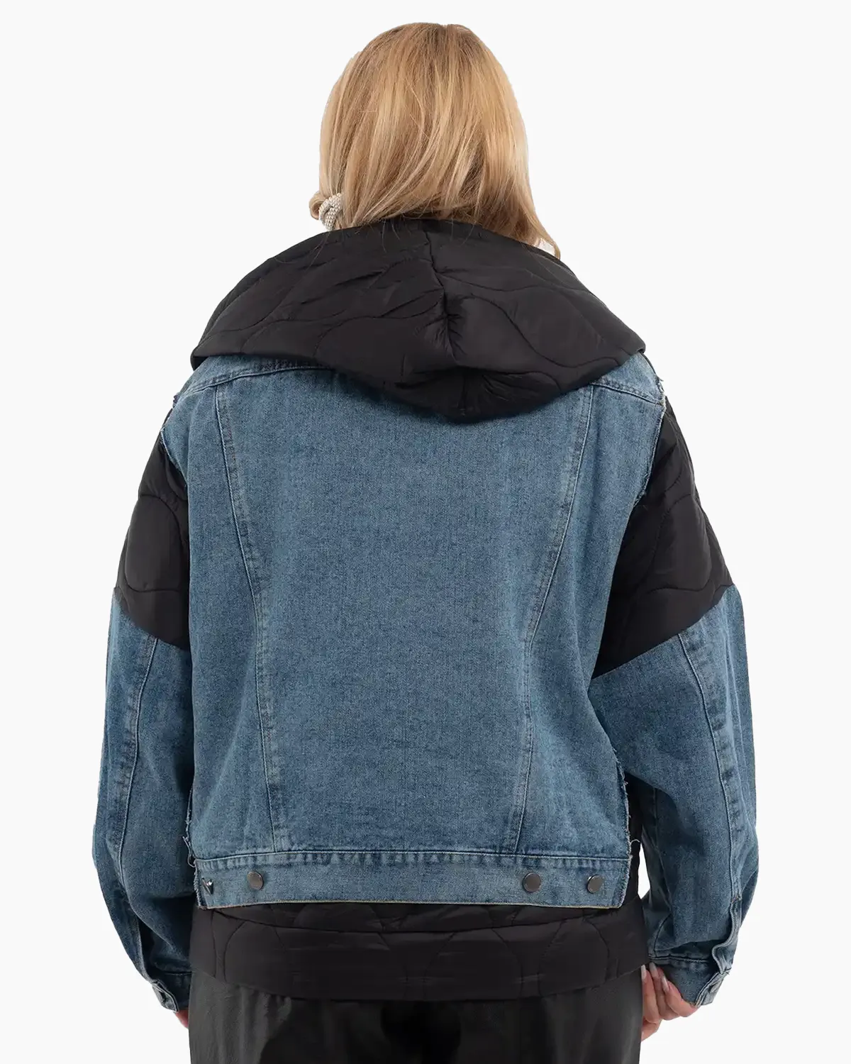 Această geacă combină materialul de fâș cu elementele din blug, oferind un look urban și stilat. Cu un fermoar plasat lateral și nasturi decorativi la manșoane, geaca este ușor de îmbrăcat și oferă confort pe tot parcursul zilei.