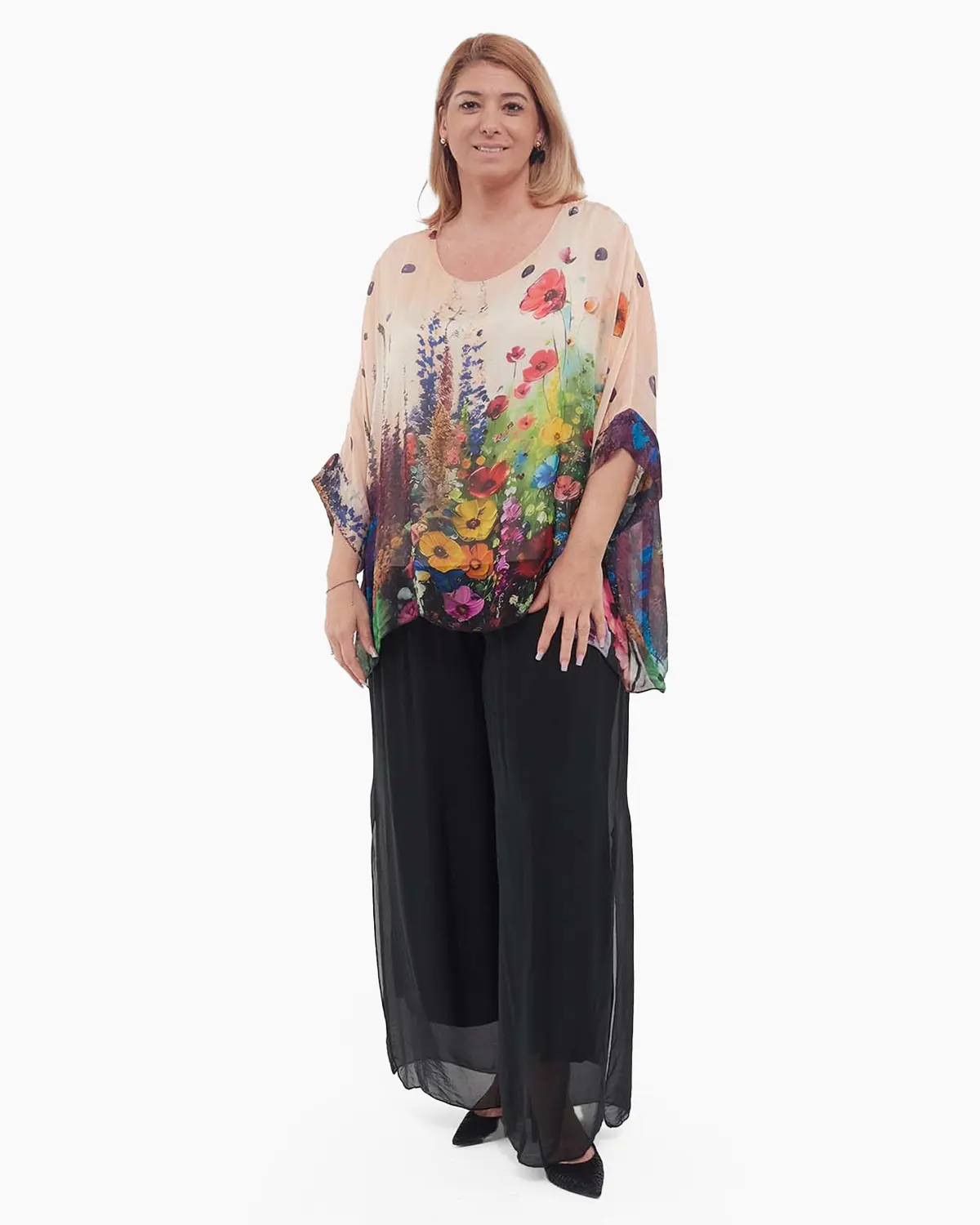 Bluză romantică crem din mătase naturală, cu un imprimeu floral delicat și mâneci dolman elegante. Croiala lejeră și căptușeala elastică asigură confort sporit, adăugând o notă rafinată și feminină ținutelor tale de zi sau seară.