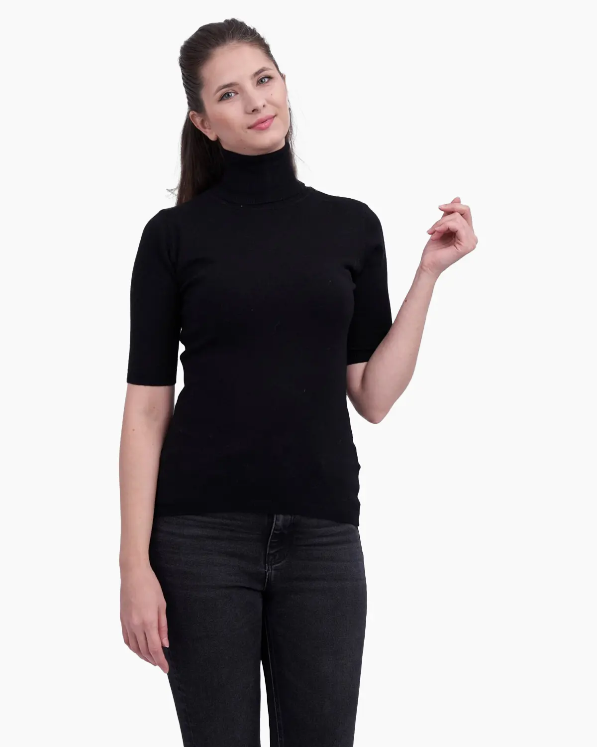 Maleta guler inalt neagra, o piesa clasica indispensabila. Tricotul sau fin si moale iti ofera o senzatie placuta, iar designul cu maneci scurte si guler rulat iti contureaza elegant silueta. Perfecta pentru un look rafinat si versatil.