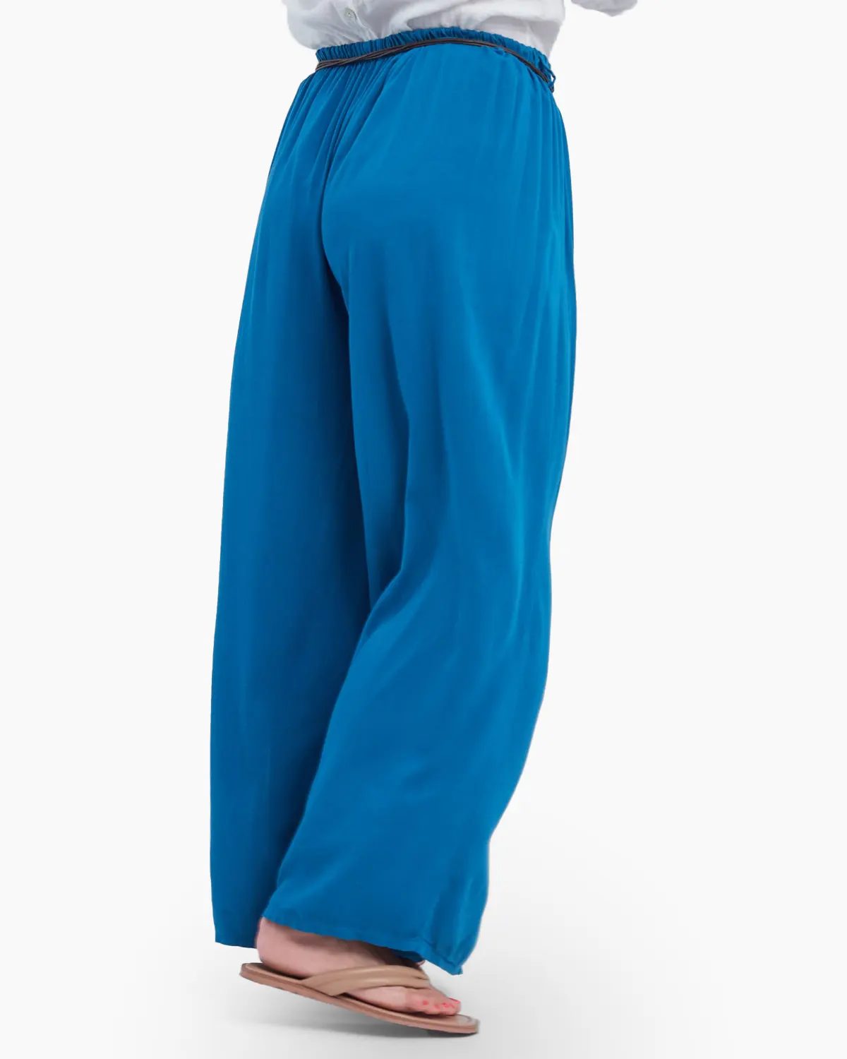 Pantaloni albastri largi din vâscoză, definitia confortului si a elegantei relaxate. Fluidi si versatili, cu talie elastica si curea inclusa, iti ofera un look chic si libertate de miscare. Imbratiseaza stilul lejer si rafinat, zi de zi.