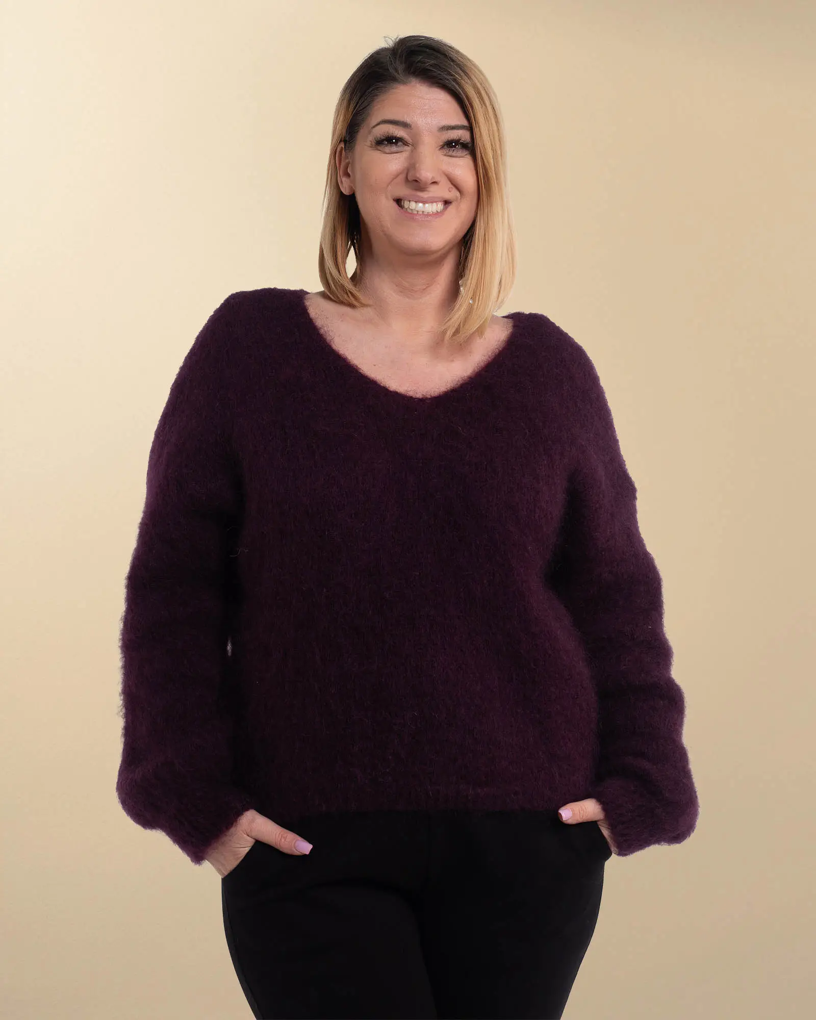 Puloverul casual din mohair mov te va cuceri prin textura sa fină și pufoasă. Croiala lejeră, cu o linie fluidă și un decolteu în V subtil, asigură o purtare confortabilă și un stil relaxat, dar rafinat pentru zilele răcoroase.
