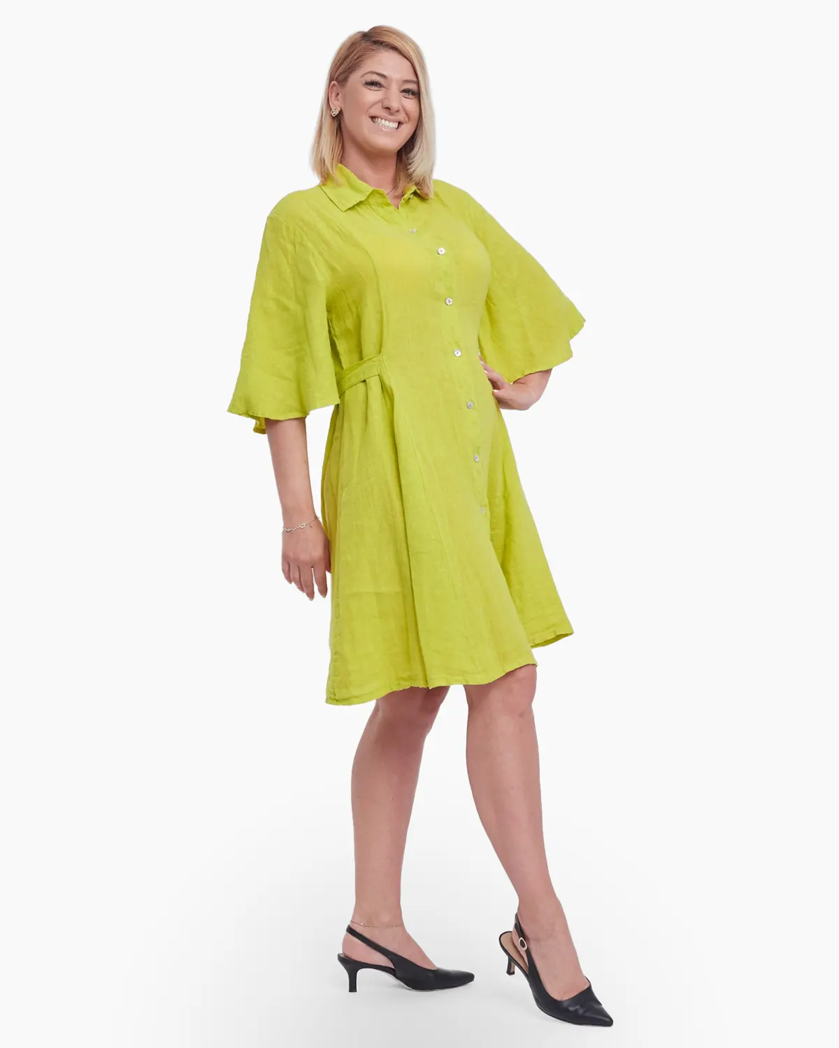 Rochie galbena din in, partenera ta ideala pentru un look sic si feminin. Confortabila si versatila, cu nasturi frontali si cordon ajustabil, iti complimenteaza silueta. O piesa must-have ce emana prospetime si energie intreaga zi.