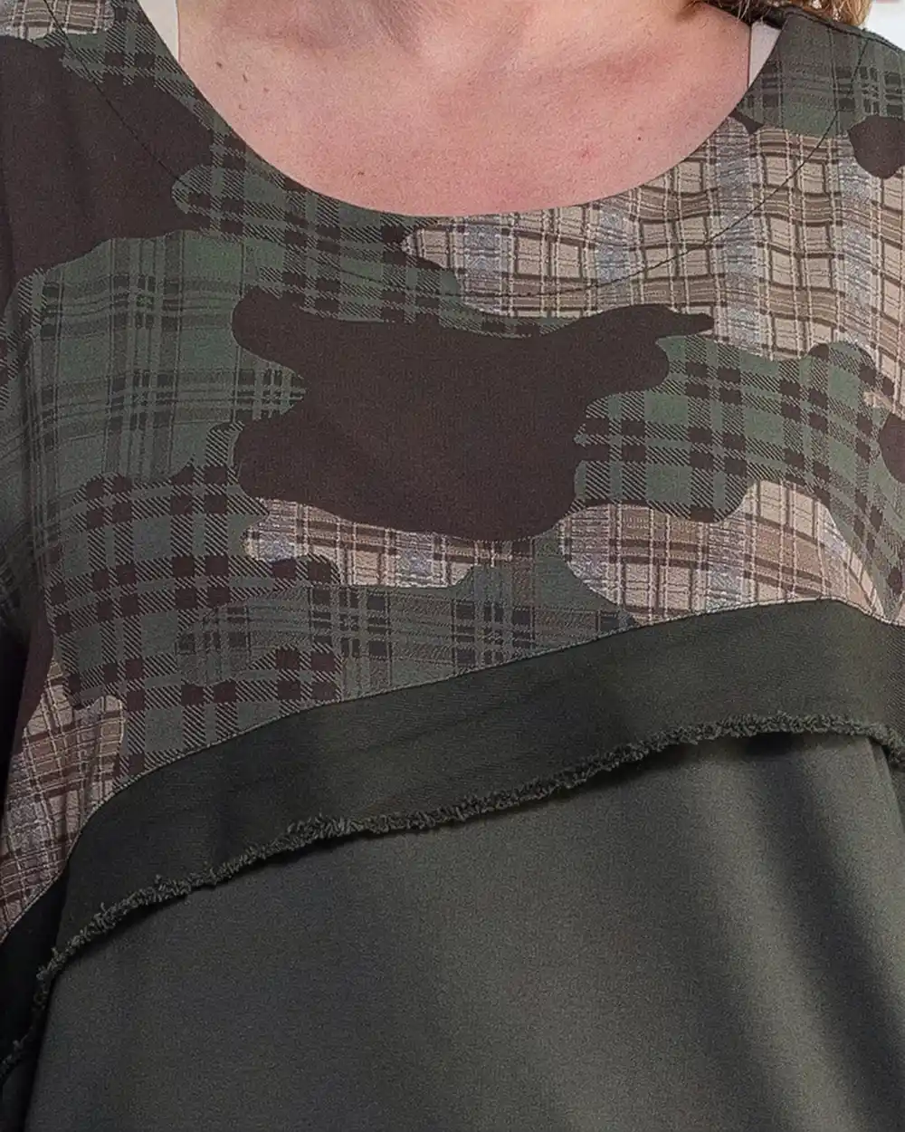 Bluză lungă urban-retro kaki din bumbac moale este alegerea ideală pentru o ținută lejeră și confortabilă. Croiala fluidă tip tunică se remarcă prin imprimeul abstract și detaliul inedit cu franjuri, oferind un aspect modern. Poart-o cu încredere alături de pantaloni simpli pentru un look casual impecabil.