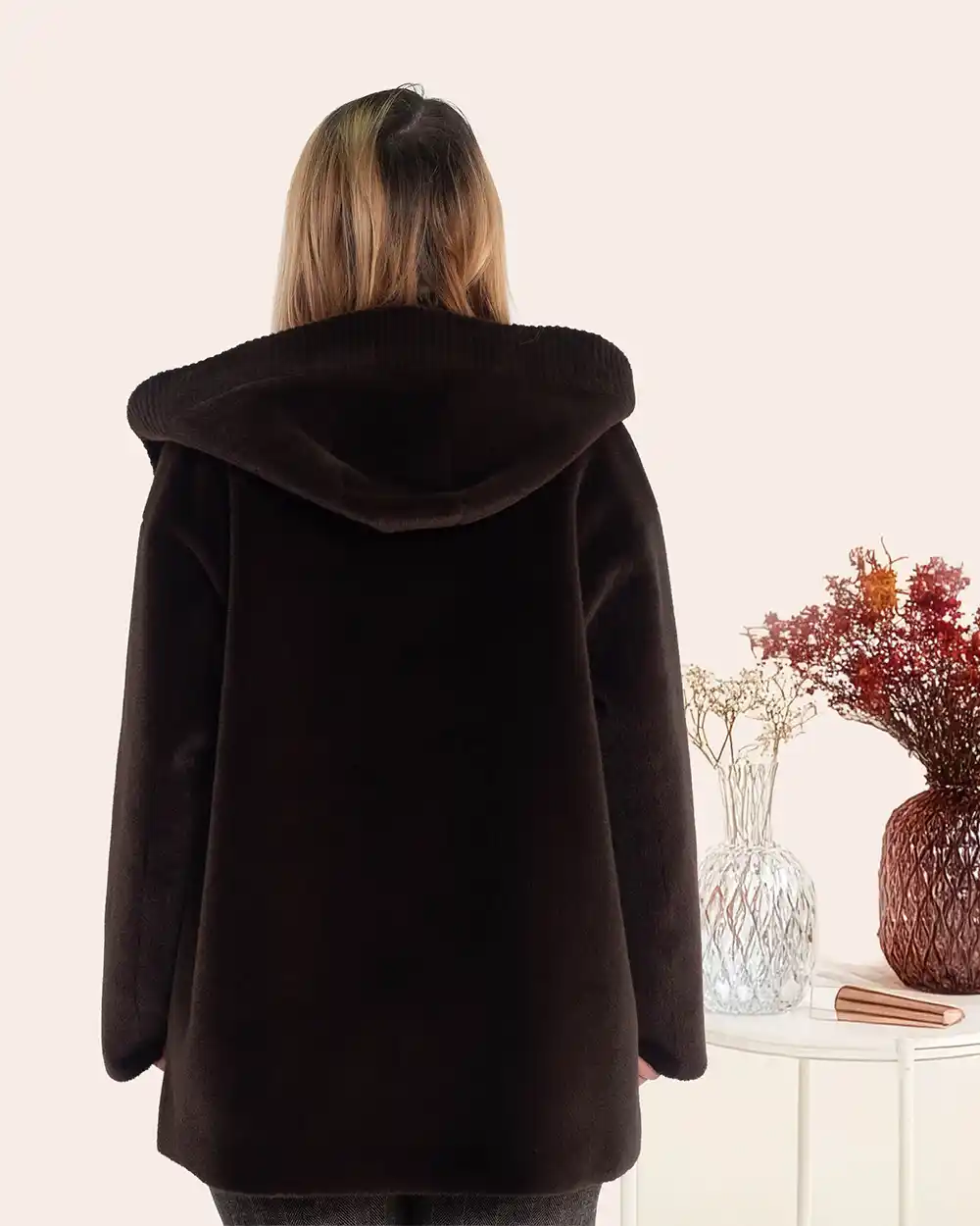 Cojoc damă maro chic, acest model reversibil surprinde prin textura fină a blăniței artificiale și aspectul de piele întoarsă. Croiala lejeră cu glugă amplă și închidere cu fermoar completează o ținută casual modernă. Este o piesă vestimentară călduroasă, ușor de integrat în garderoba ta de sezon.