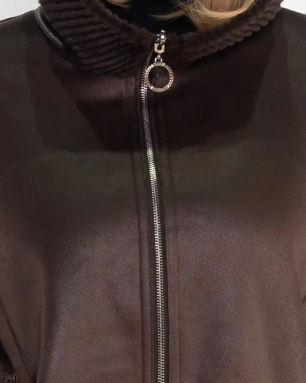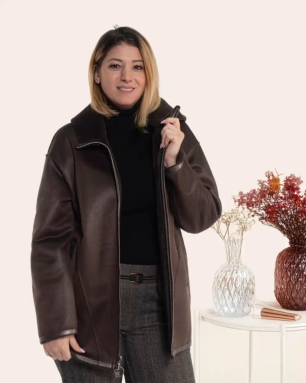 Cojocul damă maro chic redefinește versatilitatea sezonului rece. Acest model reversibil îți oferă libertatea de a alege între două texturi distincte: o blăniță artificială scurtă, incredibil de fină la atingere, și o suprafață catifelată cu aspect de piele întoarsă. Designul inteligent îți permite să schimbi aspectul ținutei într-o clipă, adaptându-te oricărei ocazii. Sistemul de închidere cu fermoar este practic și modern, transformând această jachetă maro într-un aliat de încredere în zilele răcoroase.