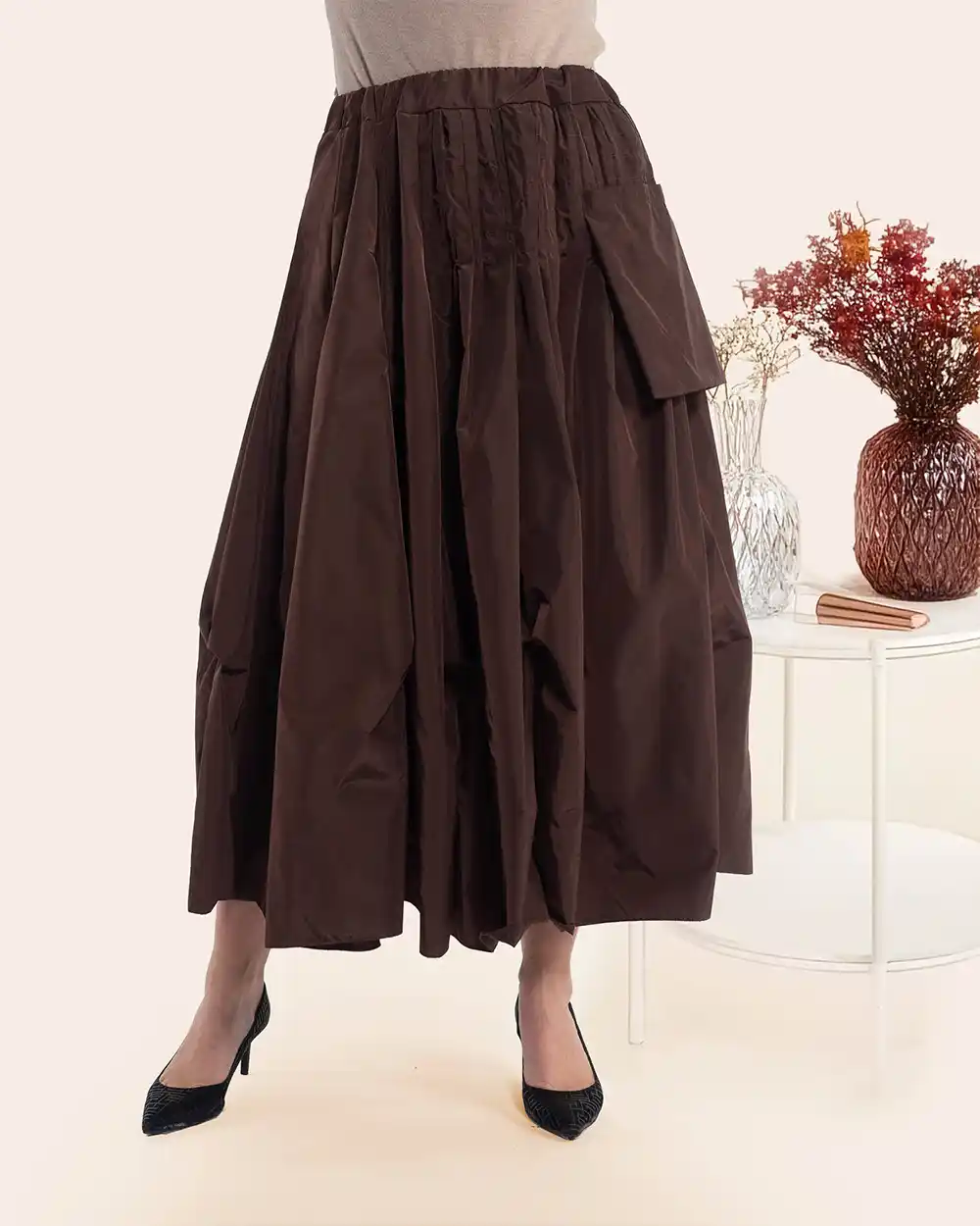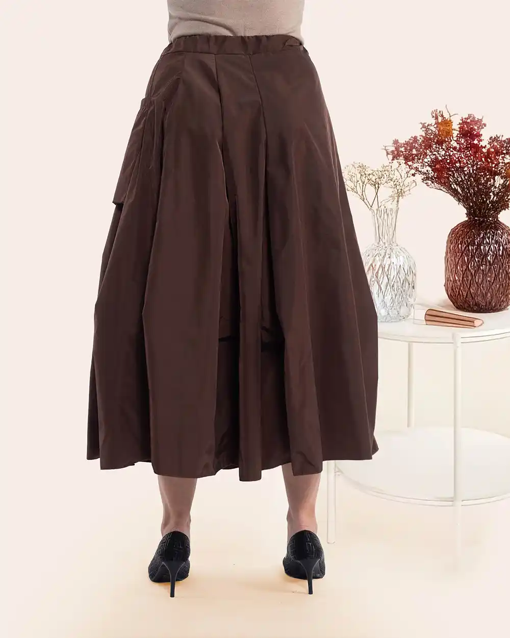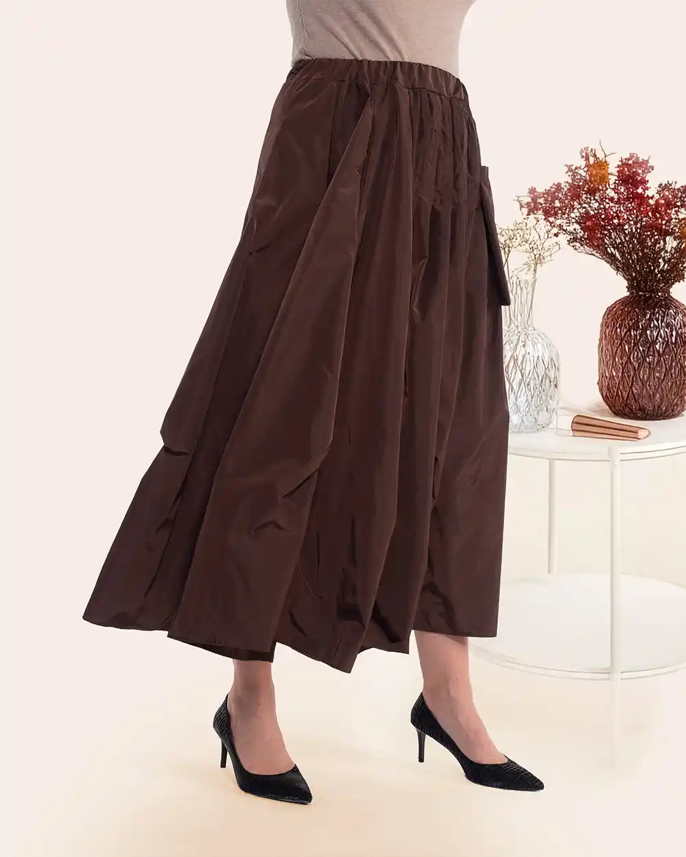 Fusta lungă casual maro redefinește confortul urban cu o notă de eleganță. Croiala sa generoasă în cloș creează o siluetă relaxată, care se mișcă grațios la fiecare pas. Lungimea midi, până aproape de gleznă, este ideală pentru a alungi silueta și a adăuga un aer chic oricărei ținute de zi, fiind o piesă centrală în garderoba modernă.