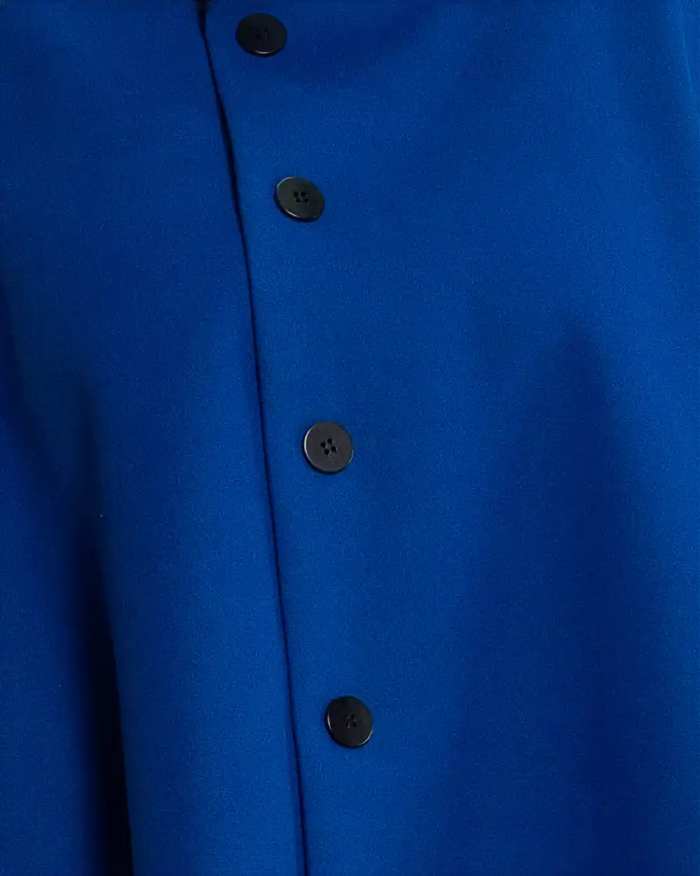 Jachetă palton casual chic într-o nuanță vibrantă de albastru regal, ideală pentru o apariție memorabilă. Croiala asimetrică și gulerul tunică adaugă distincție, în timp ce nasturii negri creează un contrast rafinat. Materialul fin și linia fluidă îți oferă libertate de mișcare și un aspect modern în orice moment.