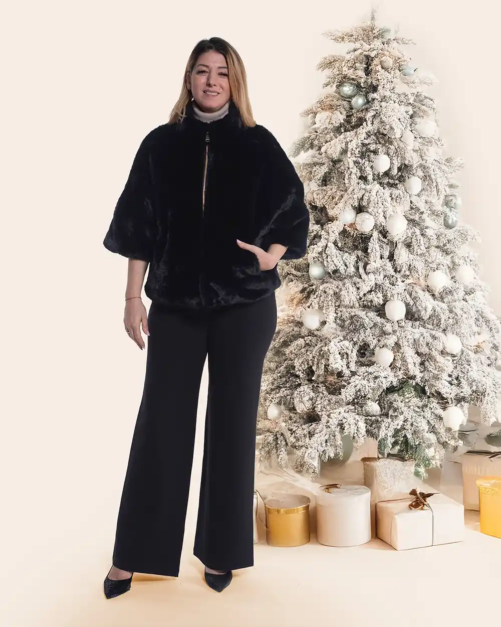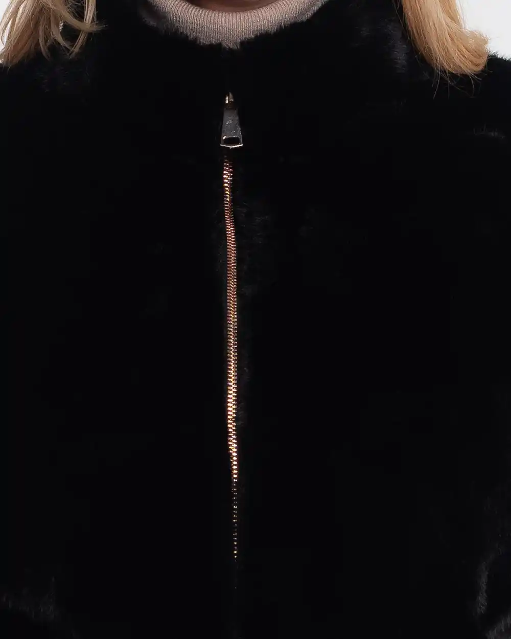 Jachetă casual neagră din blăniță moale, o piesă ce redefinește confortul cu o notă de rafinament. Textura sa fină, incredibil de plăcută la atingere, este pusă în valoare de un luciu discret, adăugând o dimensiune sofisticată ținutei tale. Culoarea profundă de negru, într-un imprimeu uni atemporal, asigură o versatilitate maximă și o eleganță firească.
