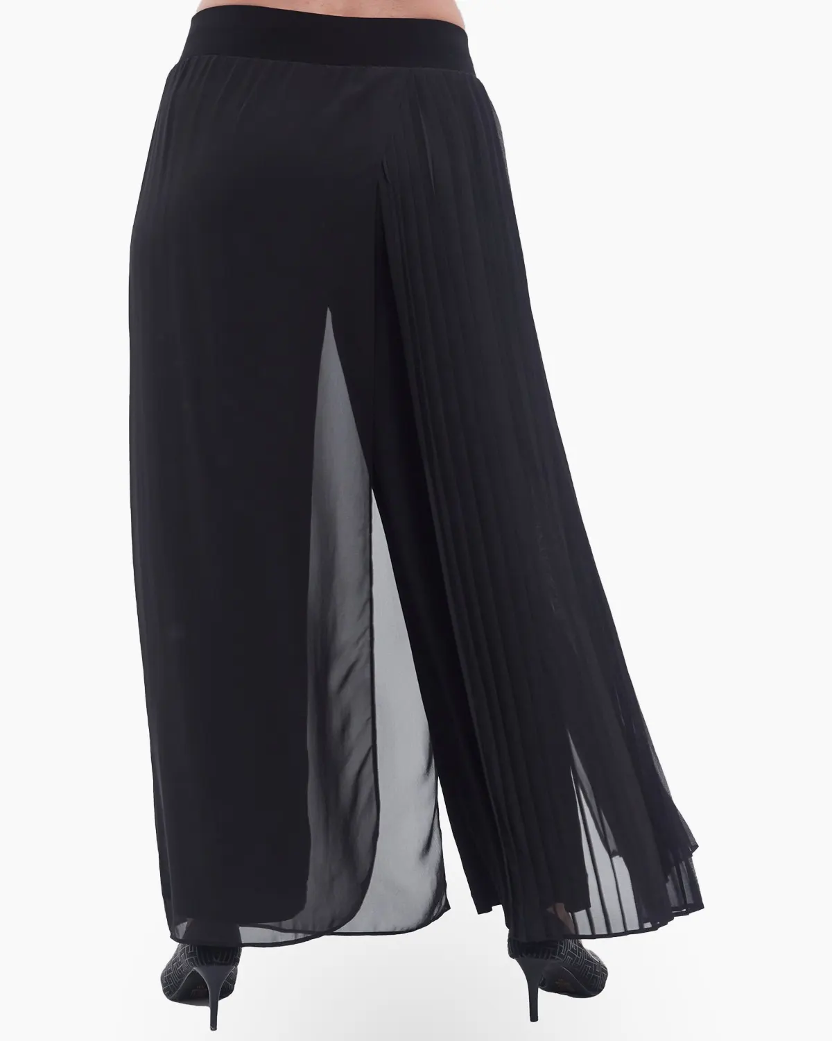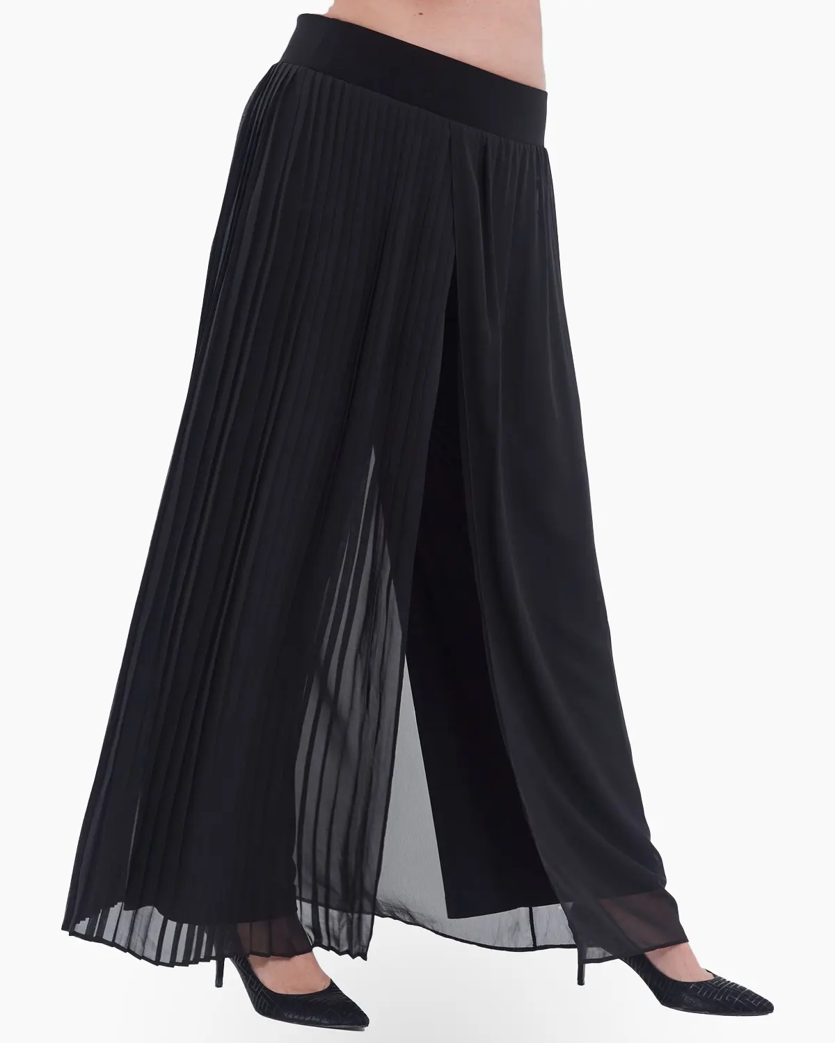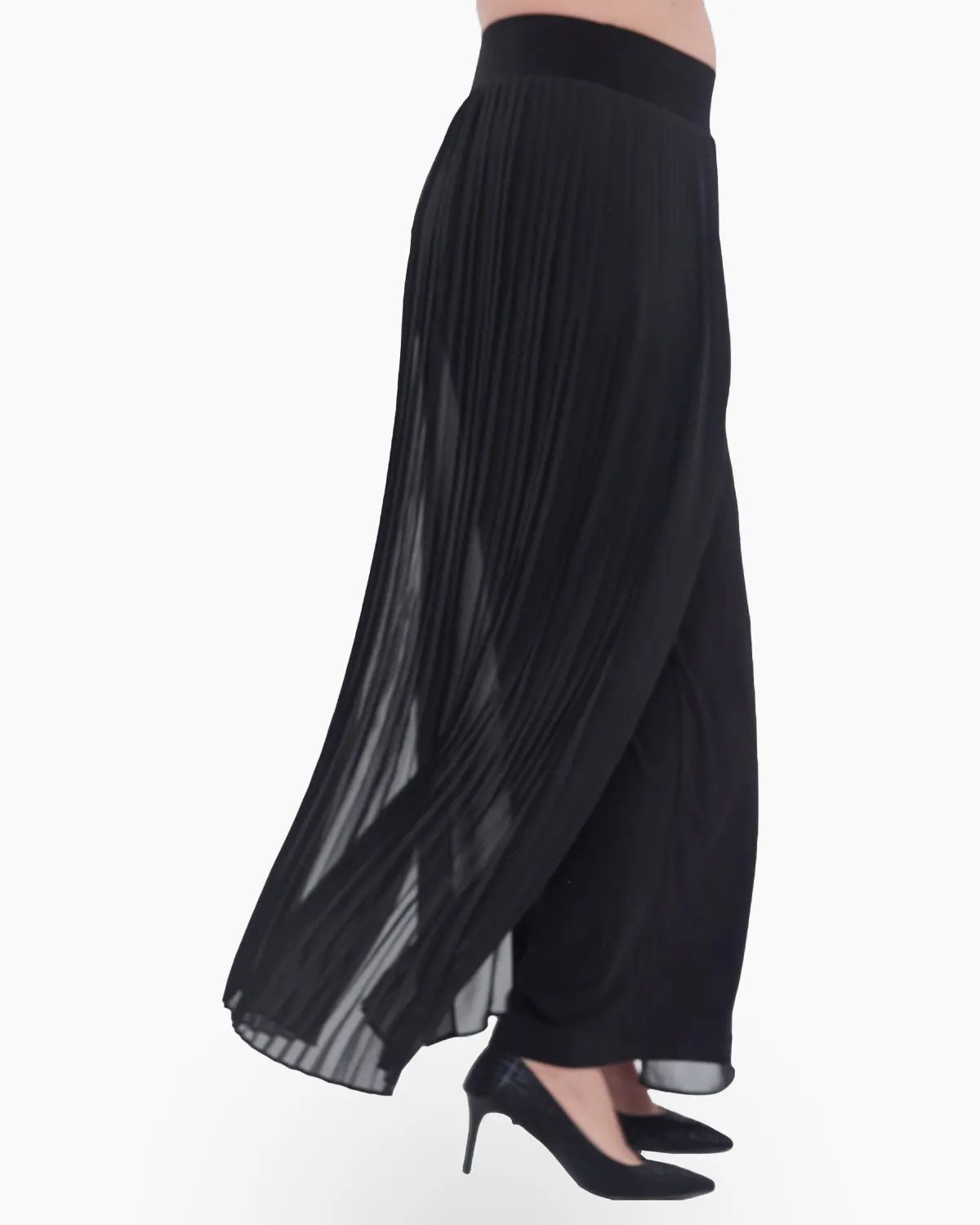 Pantaloni palazzo negri eleganți din voal plisat cu talie elastică și croială fluidă