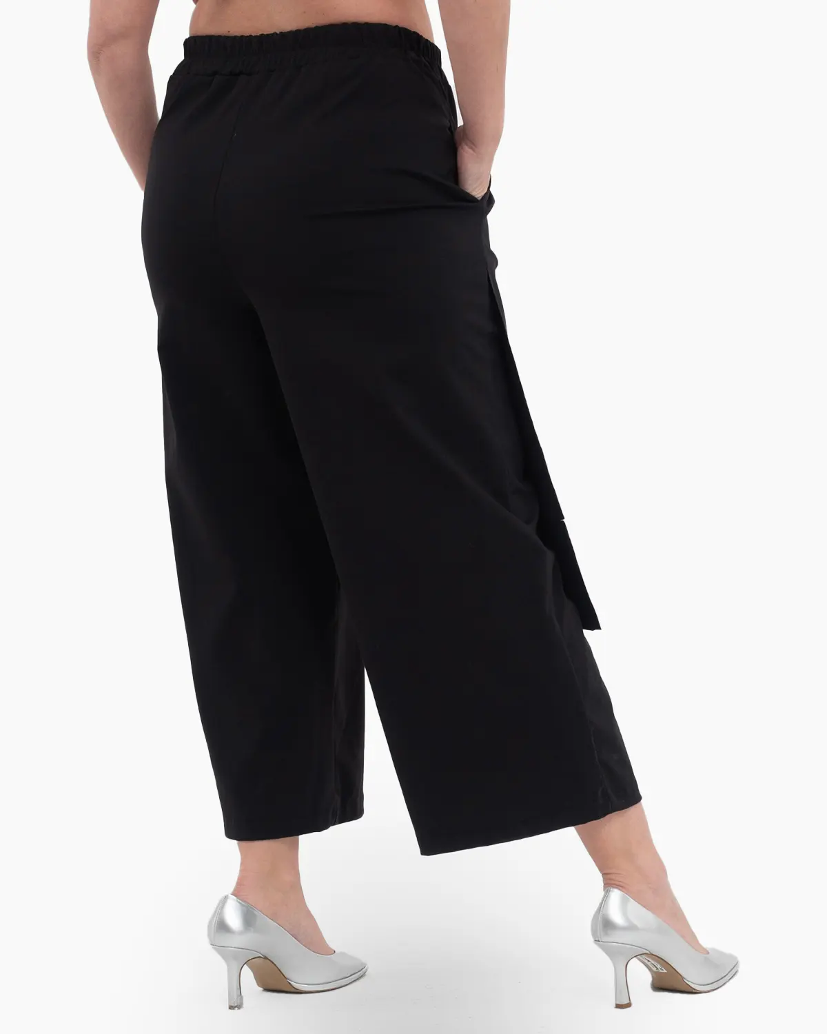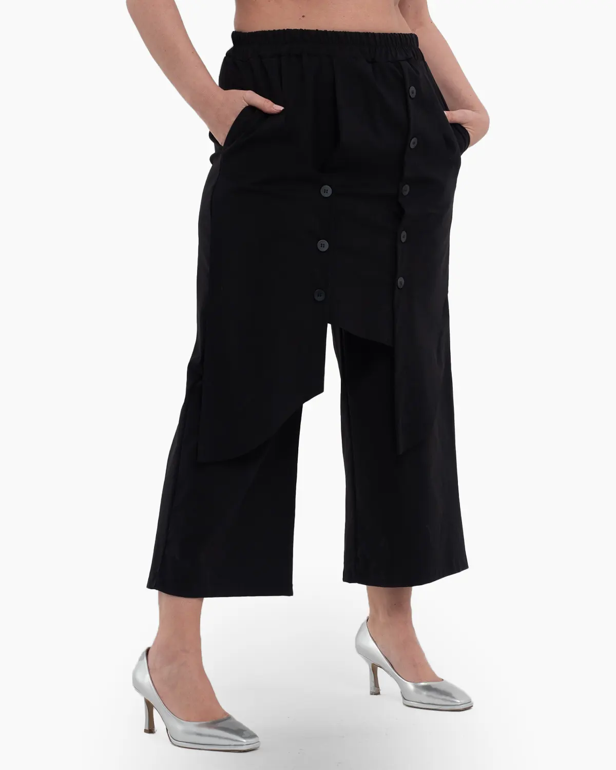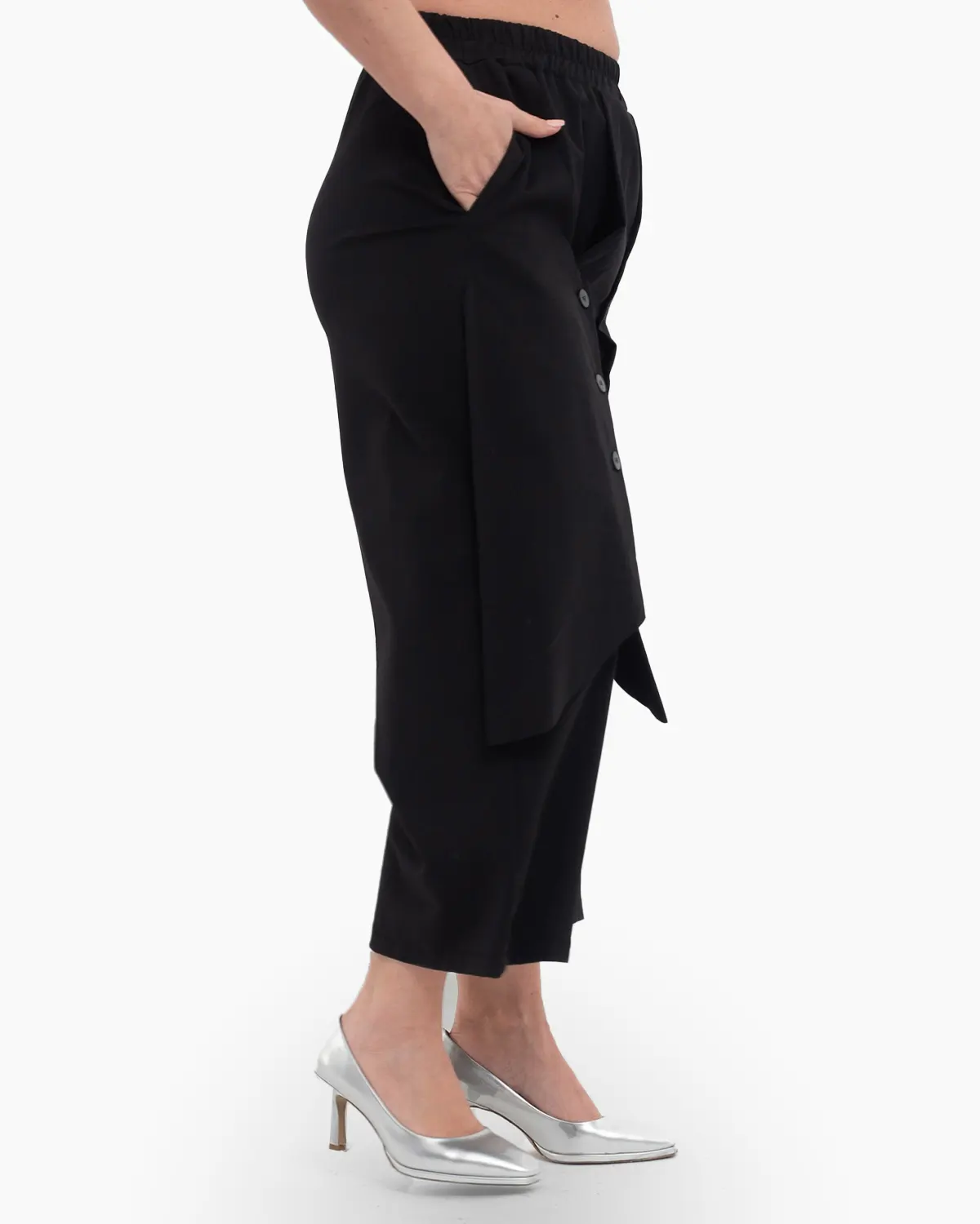 Pantalonii negri reinventeaza stilul zilnic prin detaliile lor unice cu nasturi si croiala asimetrica.
