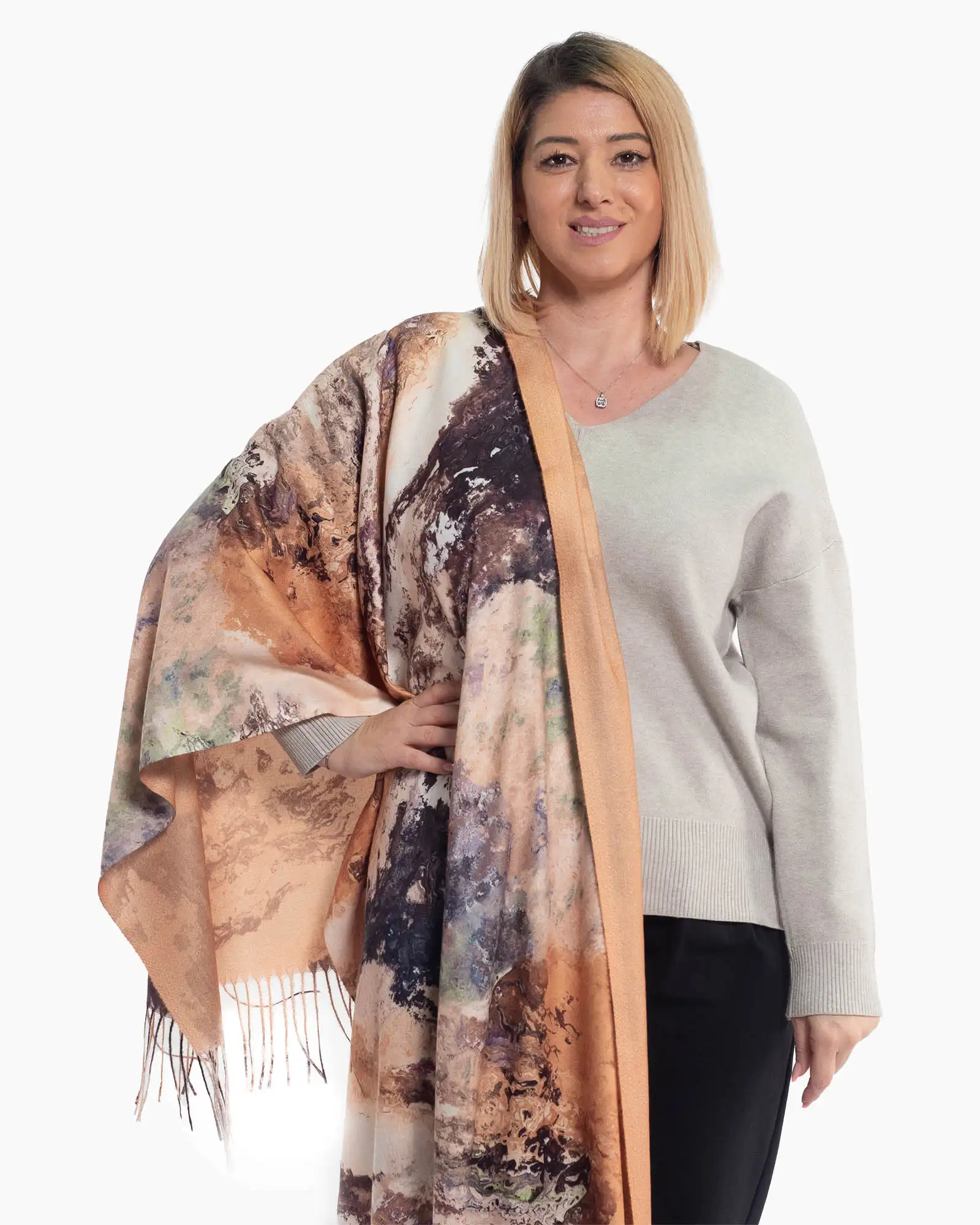 Finisată cu franjuri lungi ce adaugă mișcare și un farmec aparte, această eșarfă de damă este un accesoriu extrem de versatil. Croiala lejeră și dimensiunea unică, generoasă, o fac perfectă pentru a fi drapată pe umeri în serile răcoroase sau înnodată creativ pentru a-ți completa ținuta. Este piesa ideală pentru femeia modernă care apreciază calitatea și un design unic.