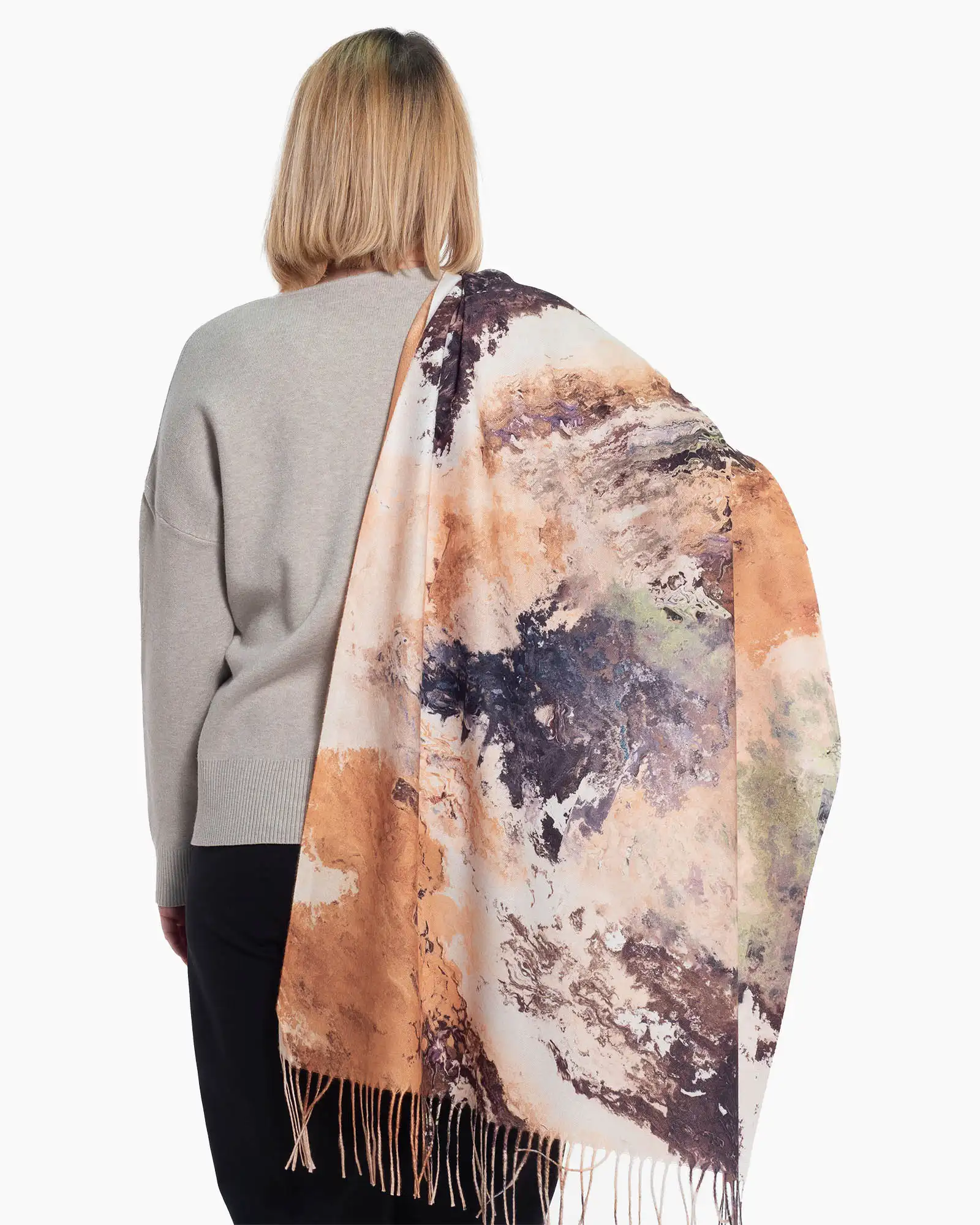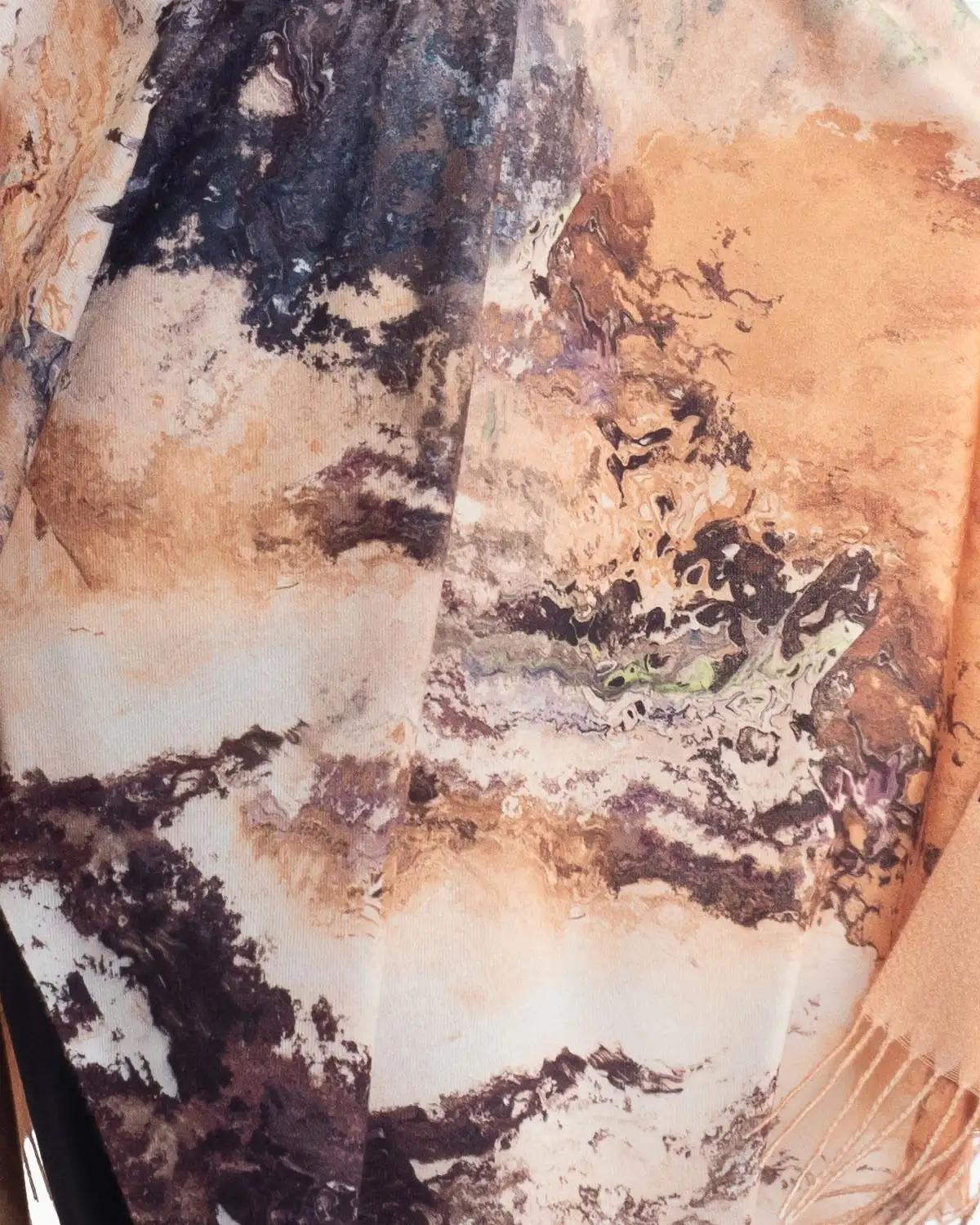 Eșarfa multicoloră din vâscoză fluidă se așază delicat, aducând o pată de culoare ținutelor tale. Imprimeul abstract este completat de franjurile lungi, creând un accesoriu versatil și rafinat, perfect pentru a-ți exprima stilul personal cu o notă artistică.