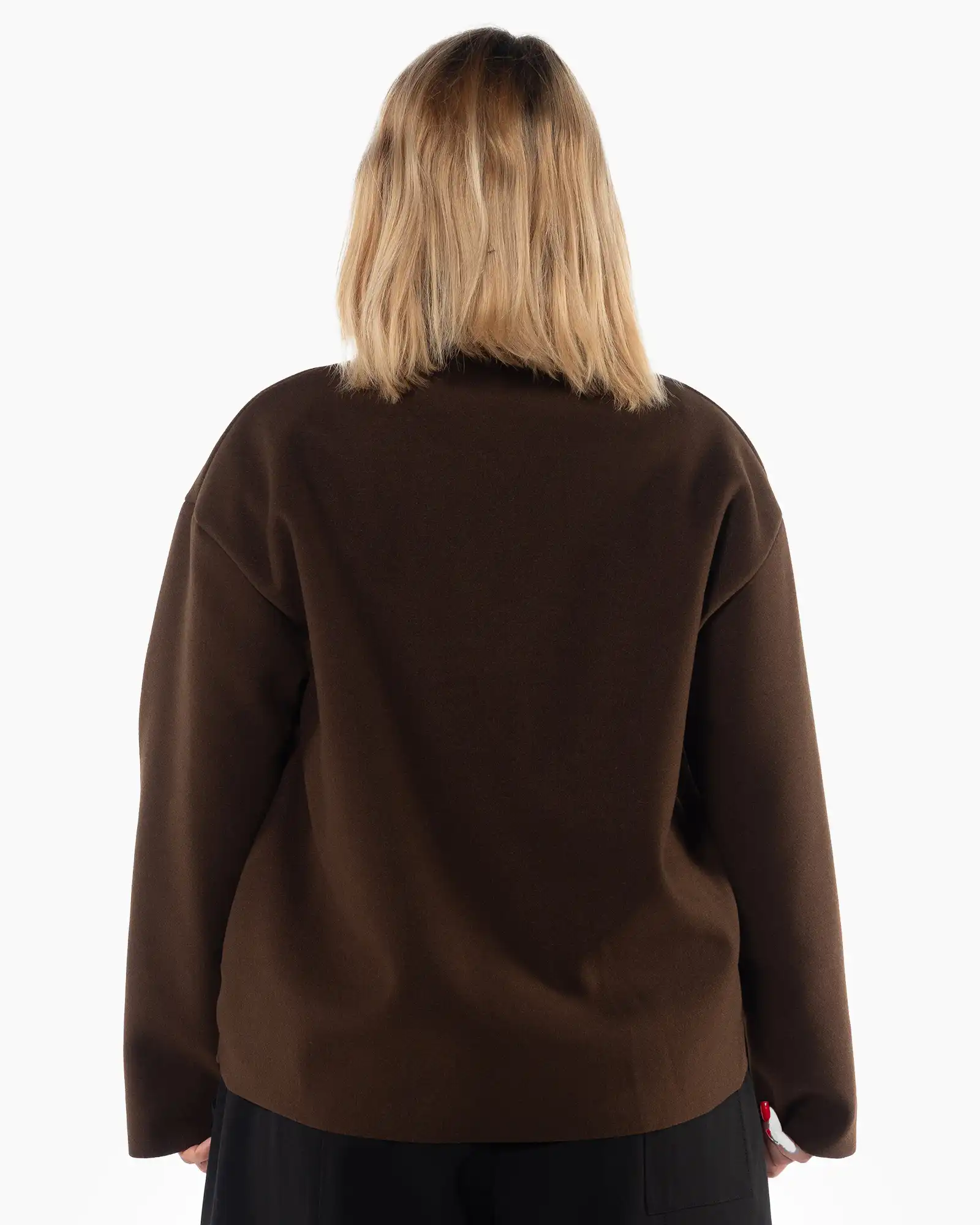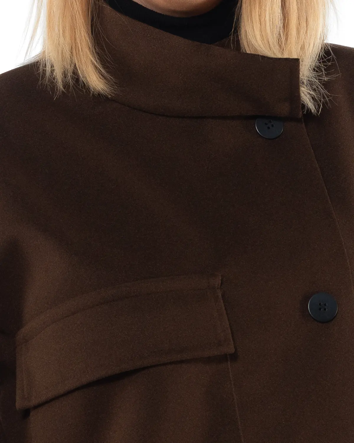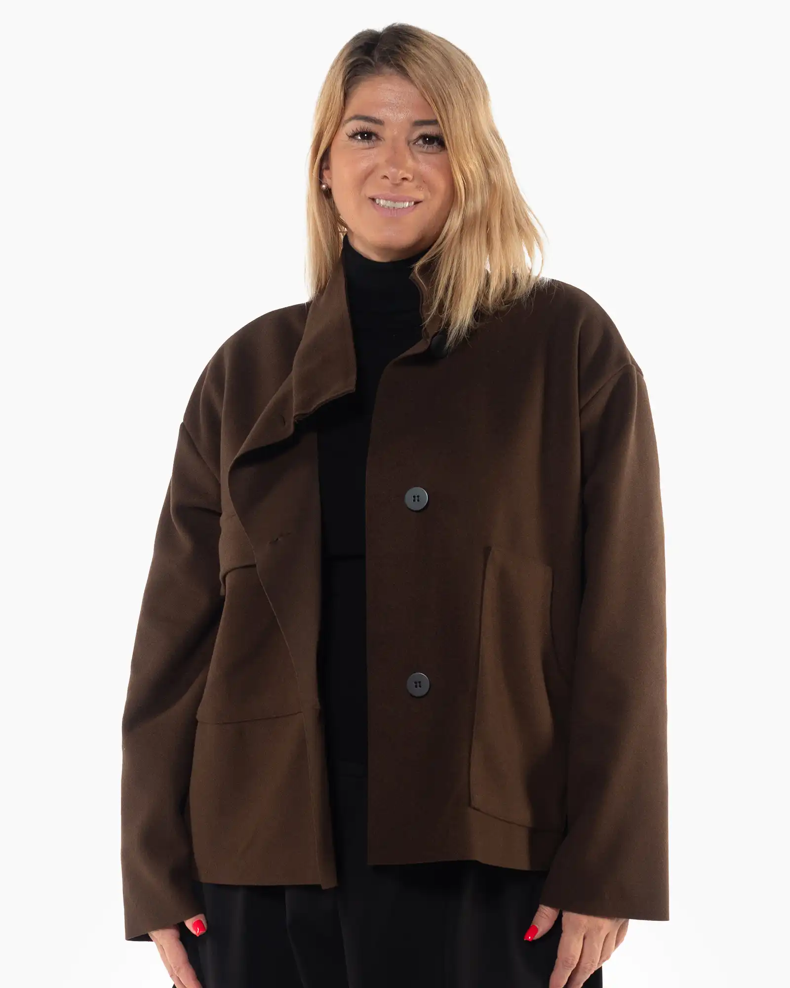 Jachetă elegantă maro, cu o croială lejeră și mâneci dolman ce conturează o siluetă relaxată, dar rafinată. Piesa ideală pentru a completa ținutele de zi în sezonul toamnă-iarnă, îmbinând perfect confortul cu un design modern și buzunare practice.