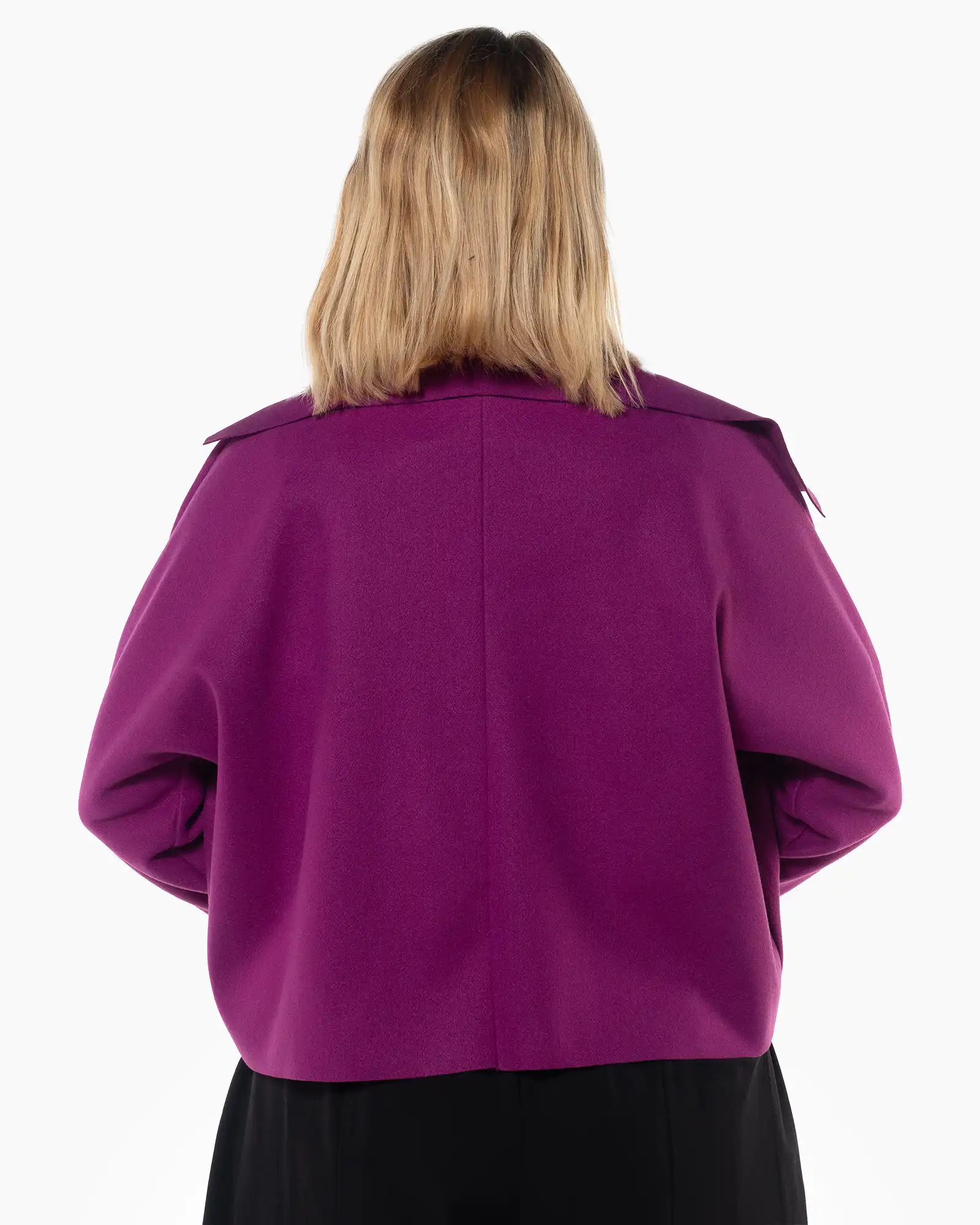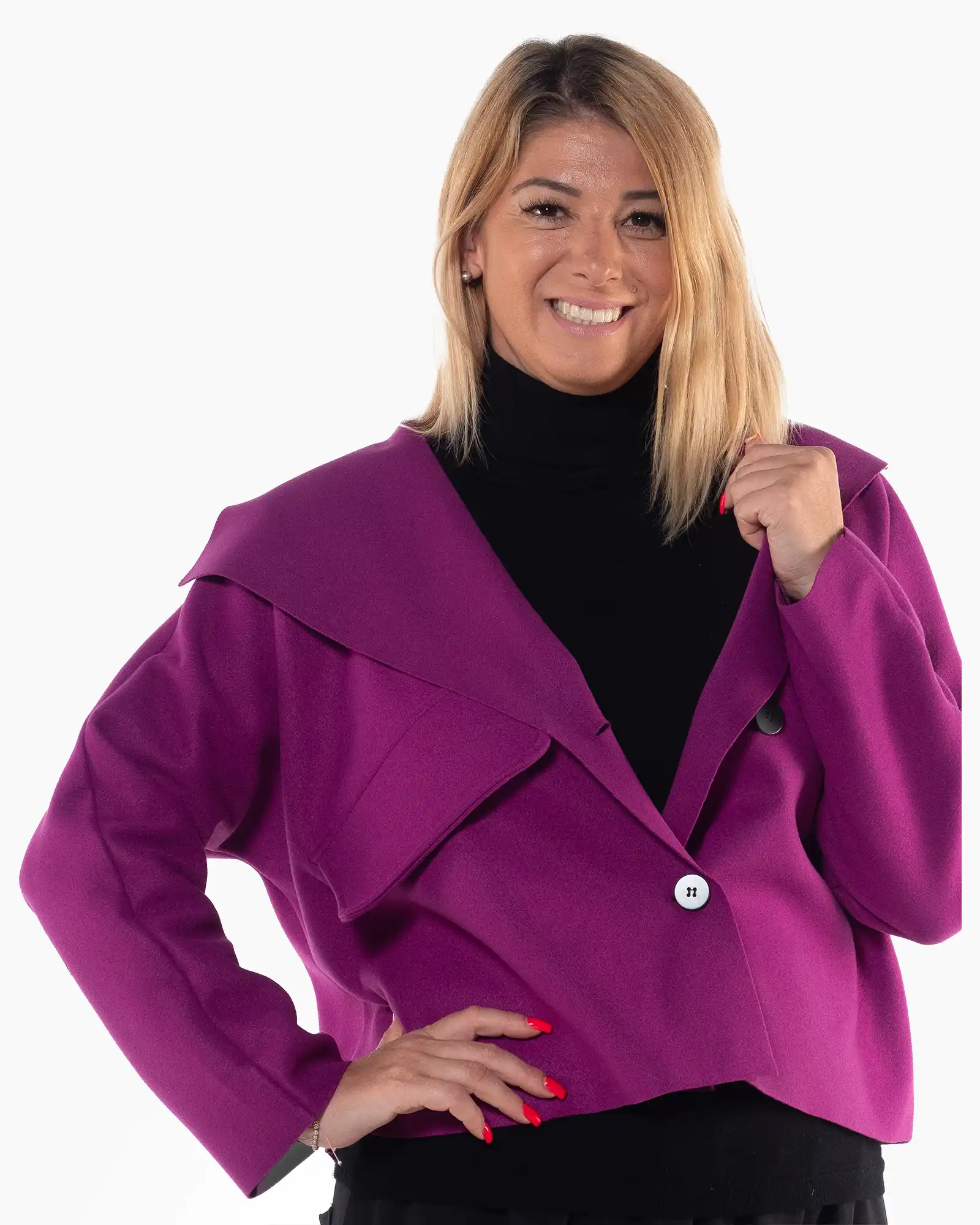 Realizată într-o nuanță vibrantă de mov, aceasta se remarcă prin croiala sa scurtă, ce se așază delicat deasupra taliei, accentuând subtil silueta. Gulerul șal fluid conturează un decolteu feminin în V, iar închiderea cu doi nasturi asortați și clapeta de buzunar decorativă completează aspectul sofisticat.