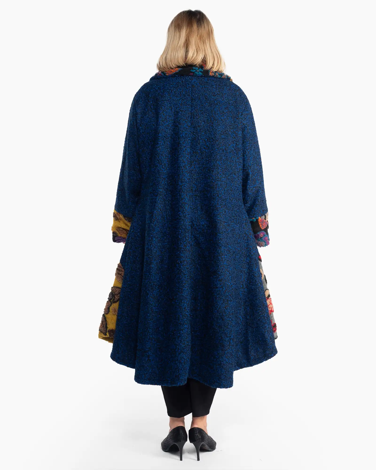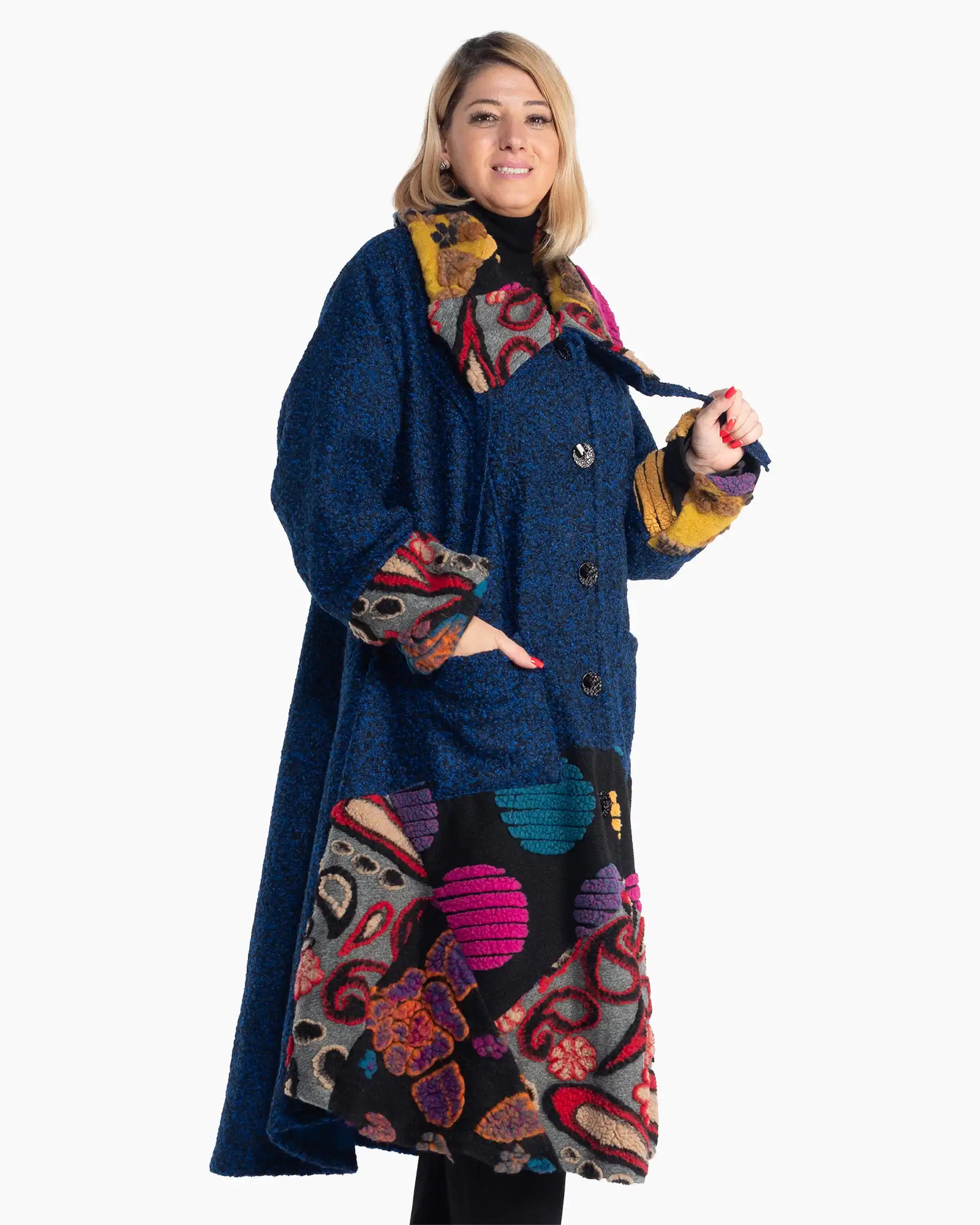 Palton lung boho bleumarin din lână cu imprimeu artistic
