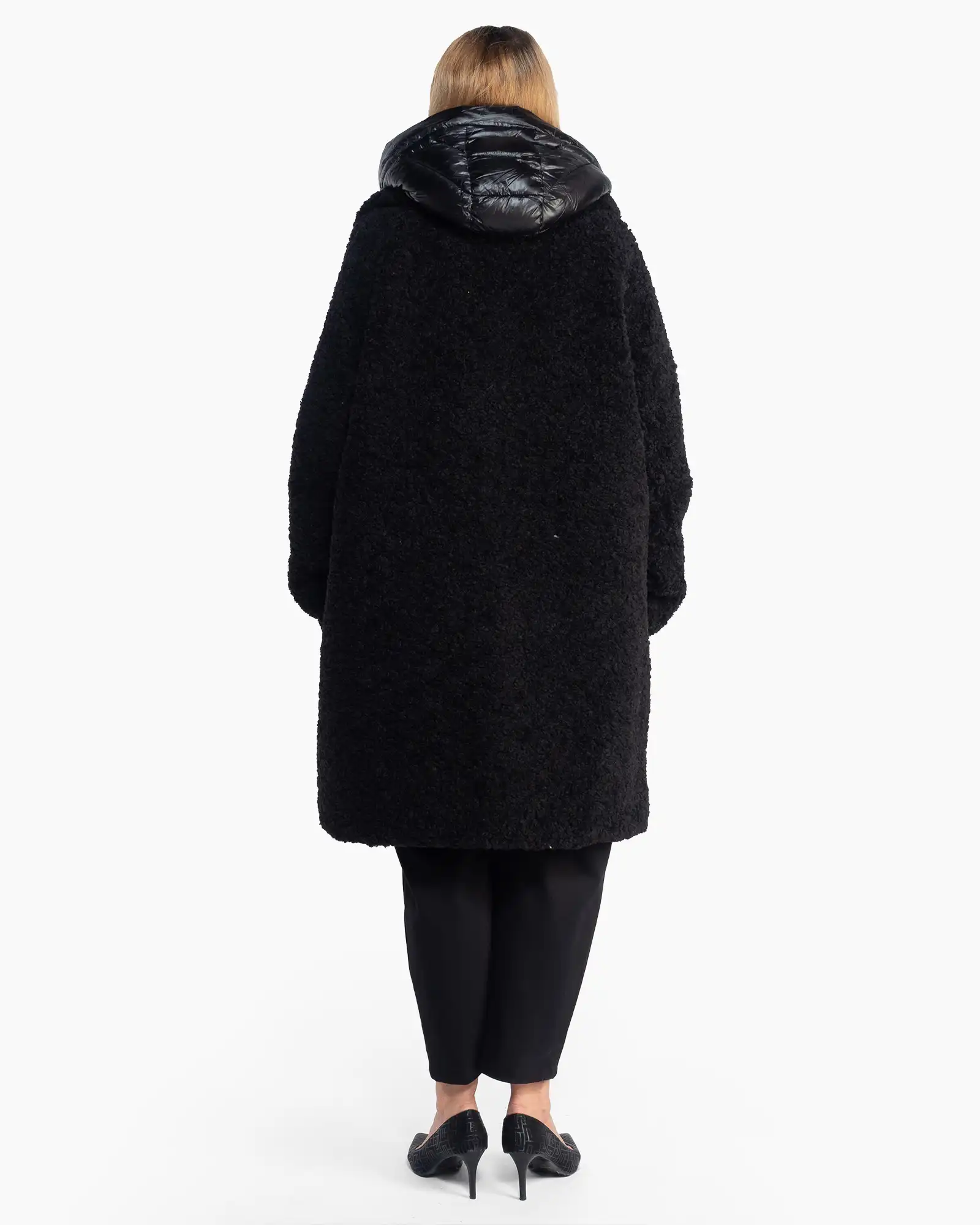 Palton negru din blană artificială boucle cu glugă detașabilă