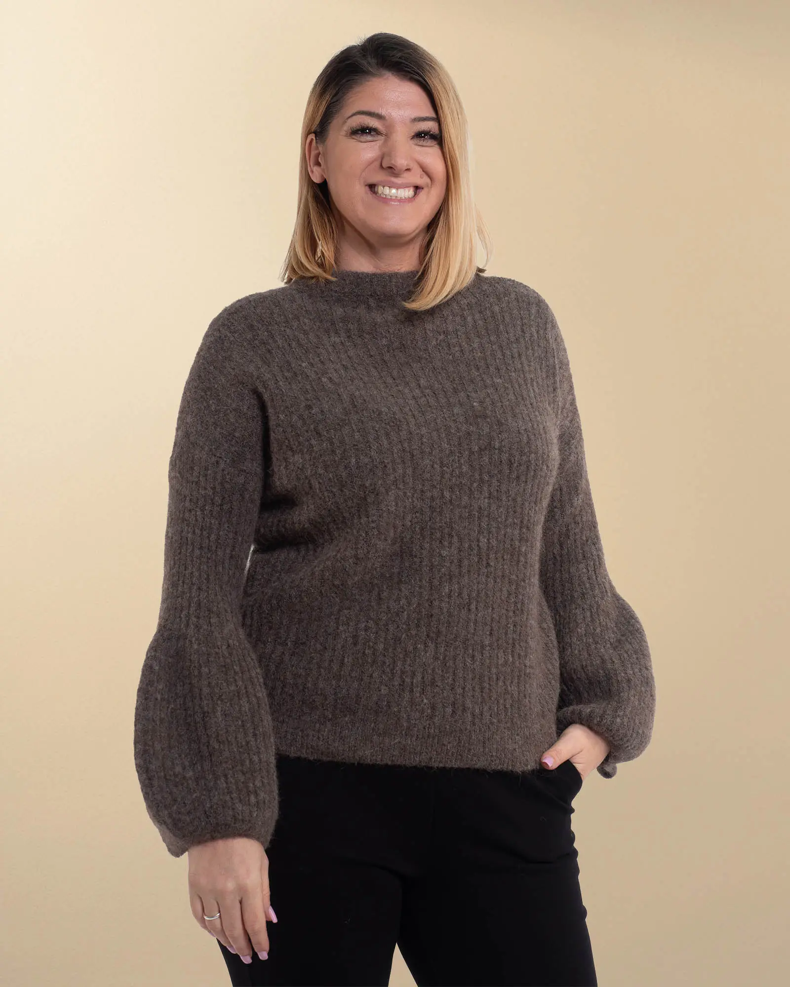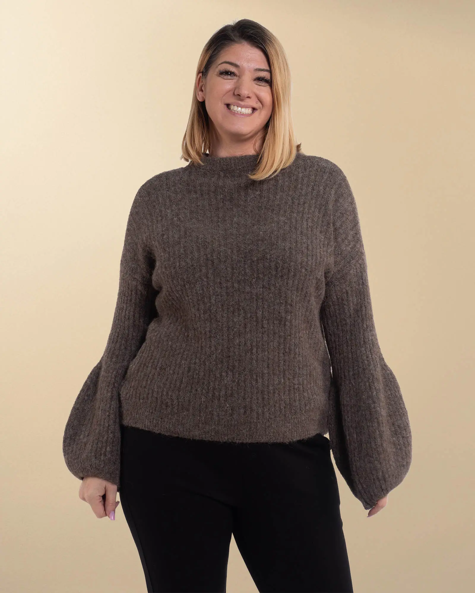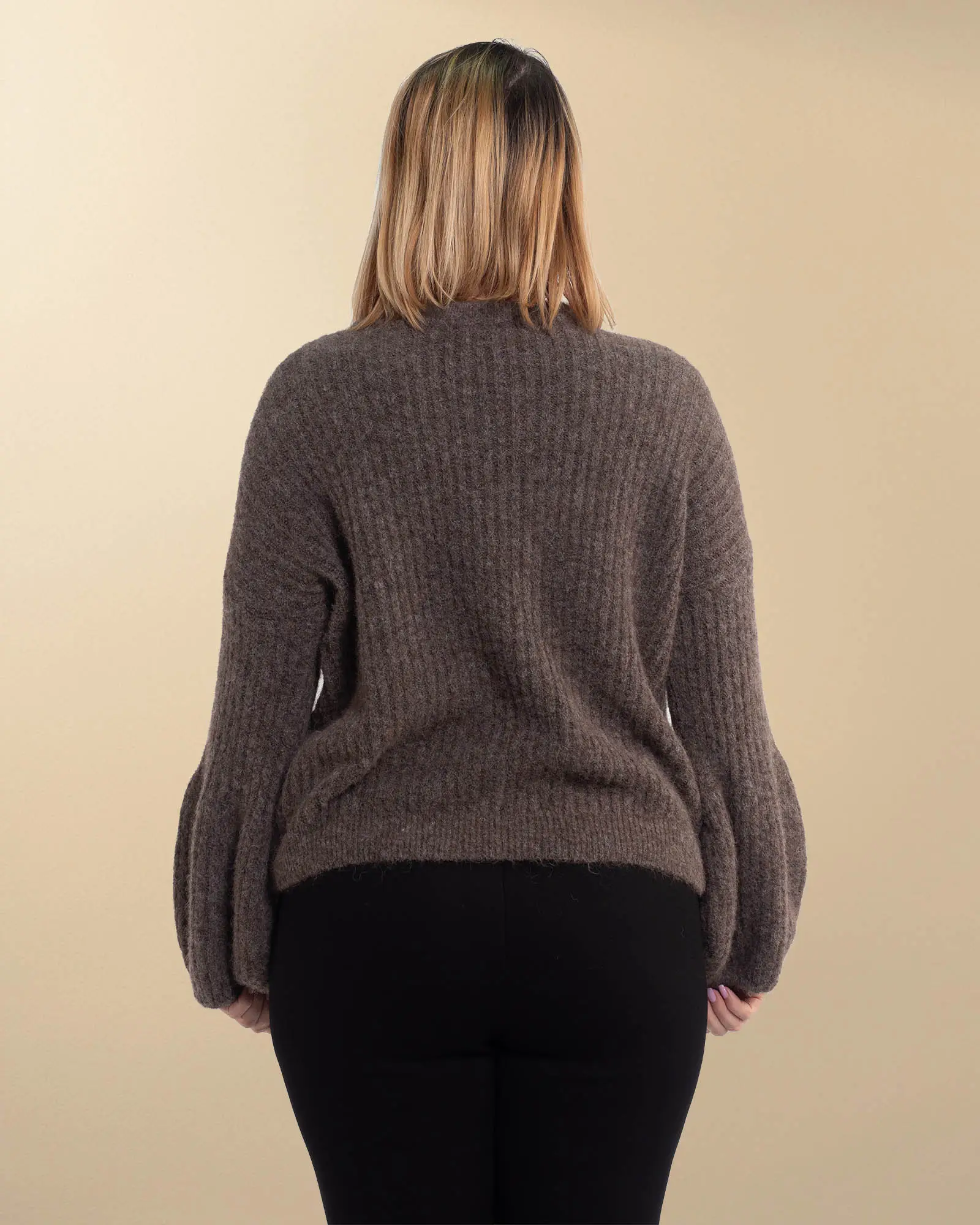 Pulover casual din lână pufoasă maro cu mâneci bufante