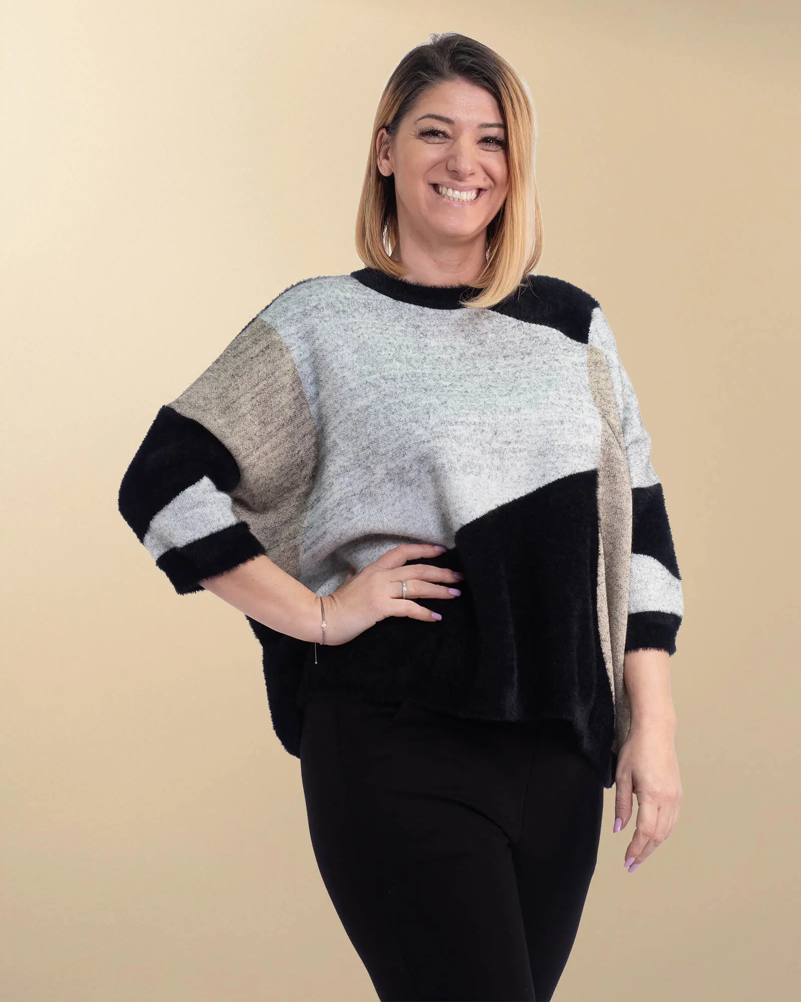 Conceput ca o mărime unică, acest pulover pufos se adaptează cu grație diferitelor conformații, fiind o opțiune excelentă inclusiv pentru persoanele care poartă mărimi de până la 5XL. Versatilitatea sa îl face perfect pentru nenumărate combinații, de la o ținută de stil casual cu blugi, la un look chic alături de o fustă plisată. Este piesa de rezistență care îmbină confortul absolut cu eleganța modernă.