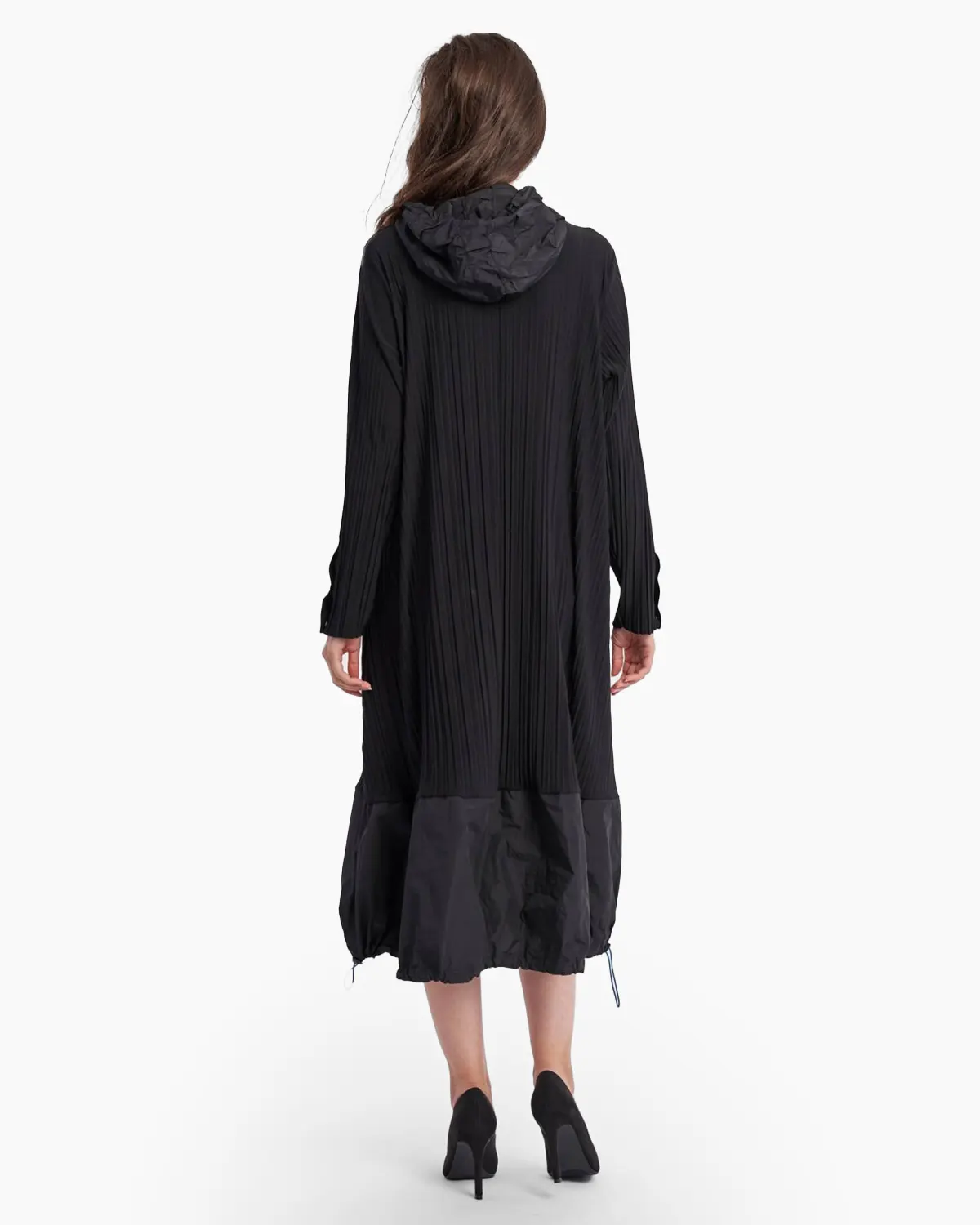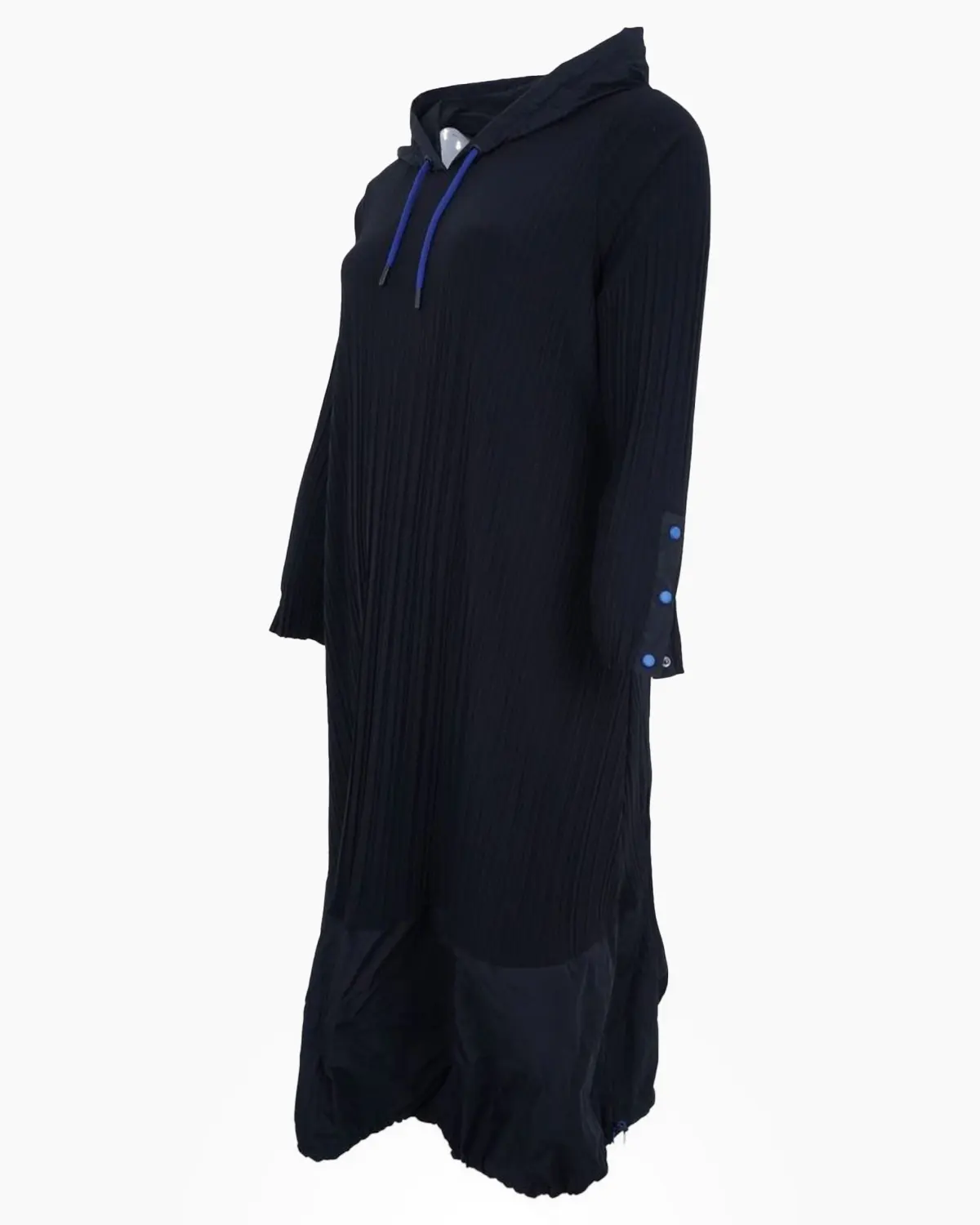 Rochie neagra plisata, eleganta atemporala ce primeste un twist contemporan si indraznet. Gluga stilata si accentele albastre vibrante adauga personalitate distincta si un farmec aparte. Perfecta pentru un look sofisticat, dar relaxat, ce emana incredere si stil unic.