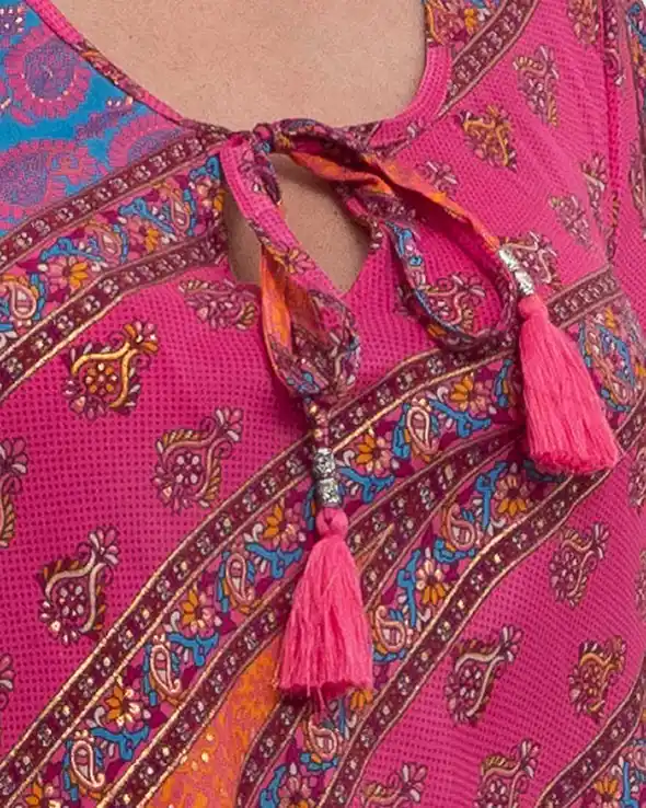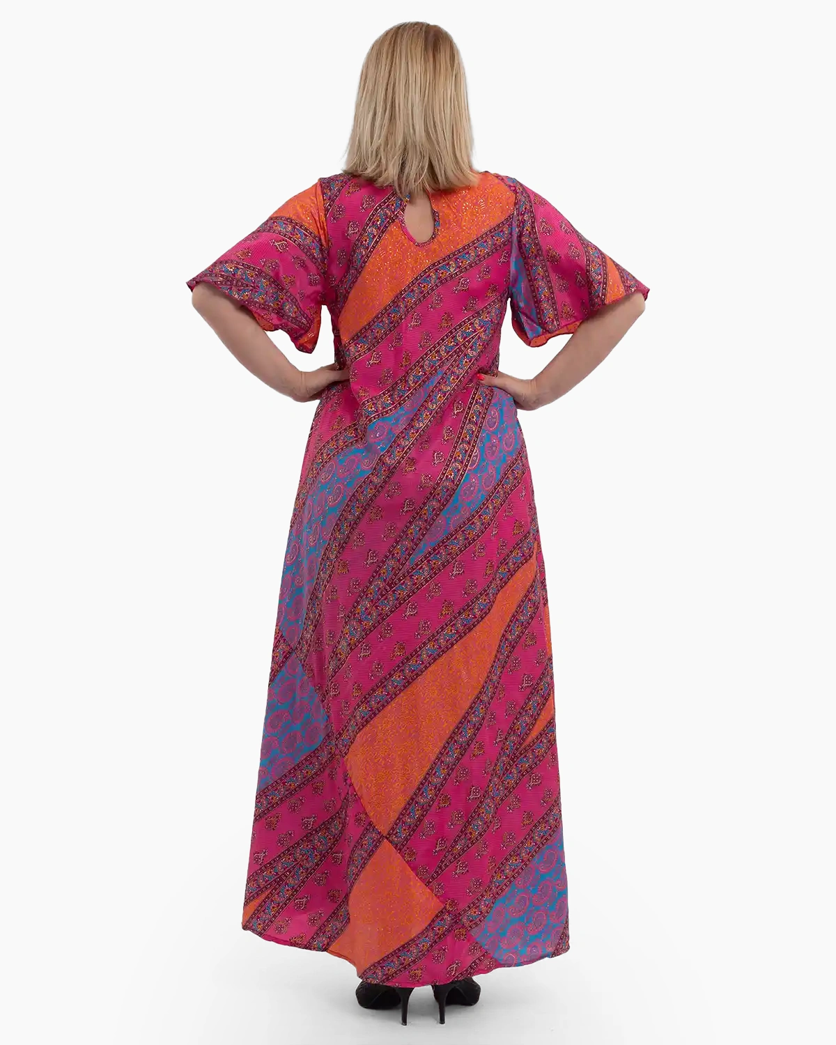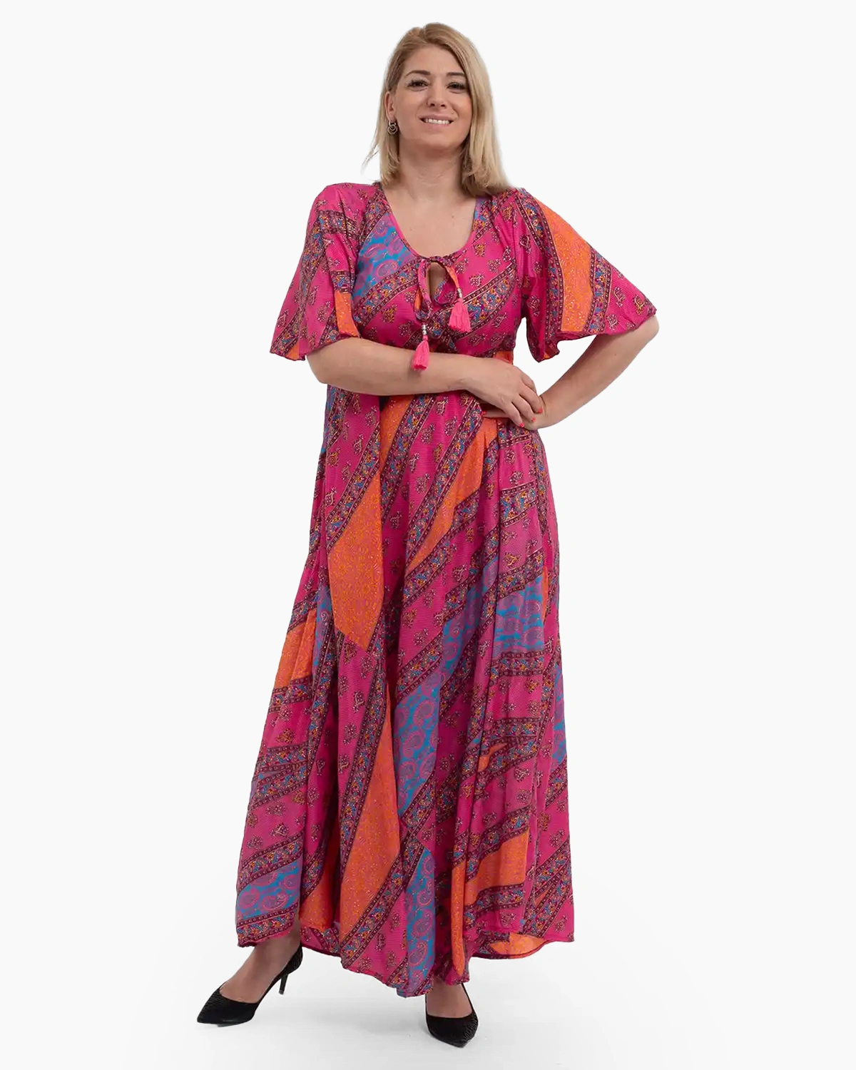 Rochie lunga matase roz, croi A, te imbraca in eleganta pura si confort desavarsit. Designul floral vibrant si manecile ample aduc rafinament oricarei ocazii. O alegere sofisticata ce iti celebreaza feminitatea cu stil si gratie diafana.