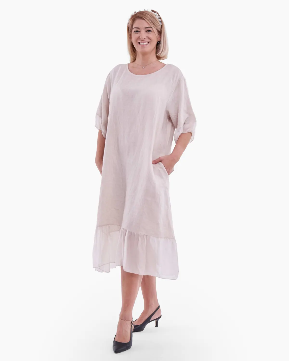Rochie lejera croi asimetric, perfecta pentru zi si seara. Din in vaporos, cu insertii rafinate din matase bej si buzunare discrete, aceasta piesa atemporala defineste un stil unic, chic si mereu actual, pentru o aparitie de neuitat.