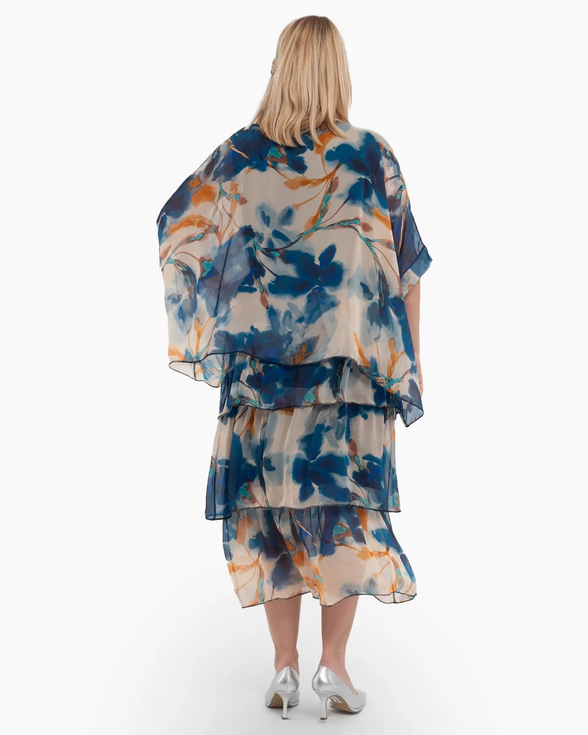 Rochie de vara albastra din matase, ce te face sa plutesti cu volane delicate intr-o visare artistica. Fluiditatea sa ofera un look stilat si confort rafinat, ideal pentru evenimente elegante. O piesa esentiala pentru un stil sofisticat.
