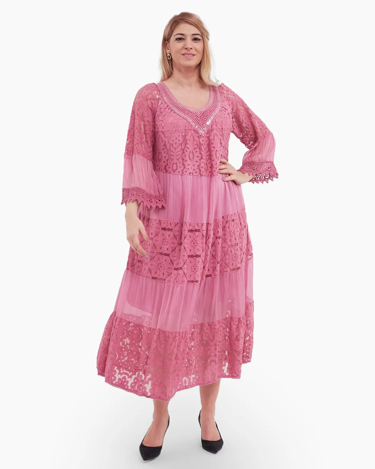 Realizata dintr un mix de tesaturi fine, aceasta rochie roz pudrat cu matase si dantela emana feminitate. Broderia indrazneata si paietele stralucitoare adauga un plus de stil, perfecta pentru evenimente unde vrei sa stralucesti cu eleganta contemporana.